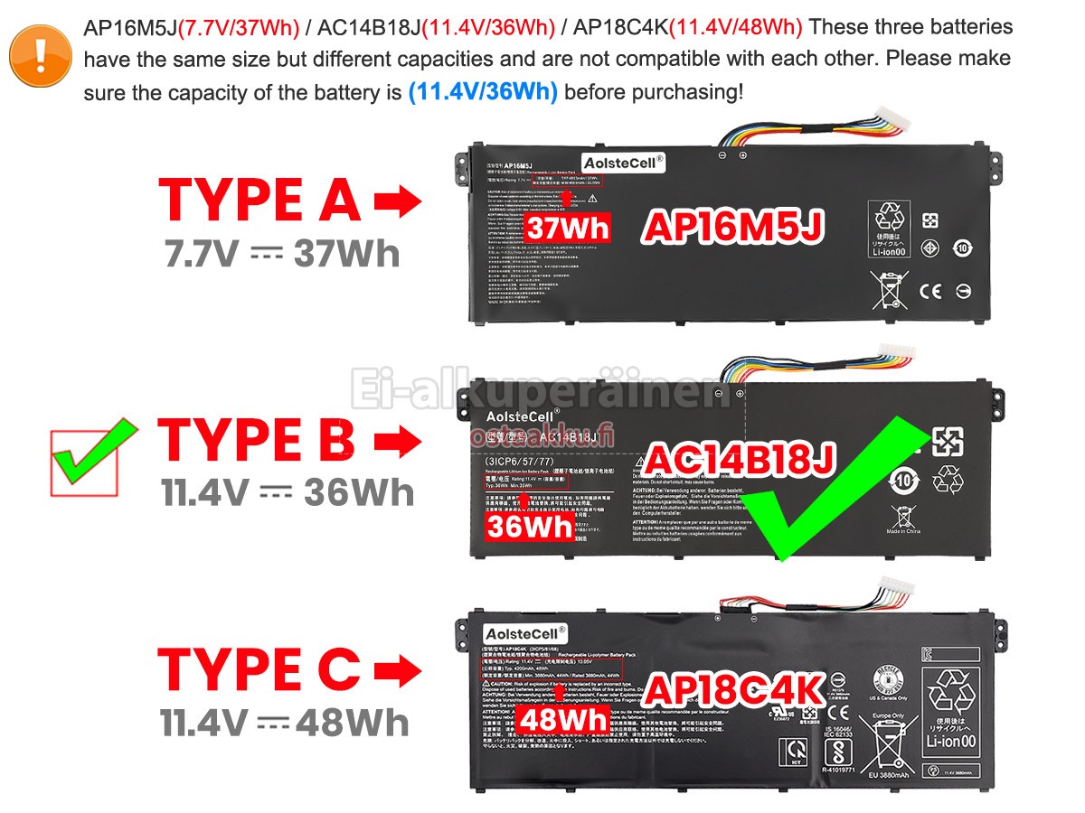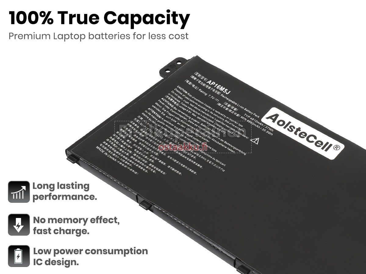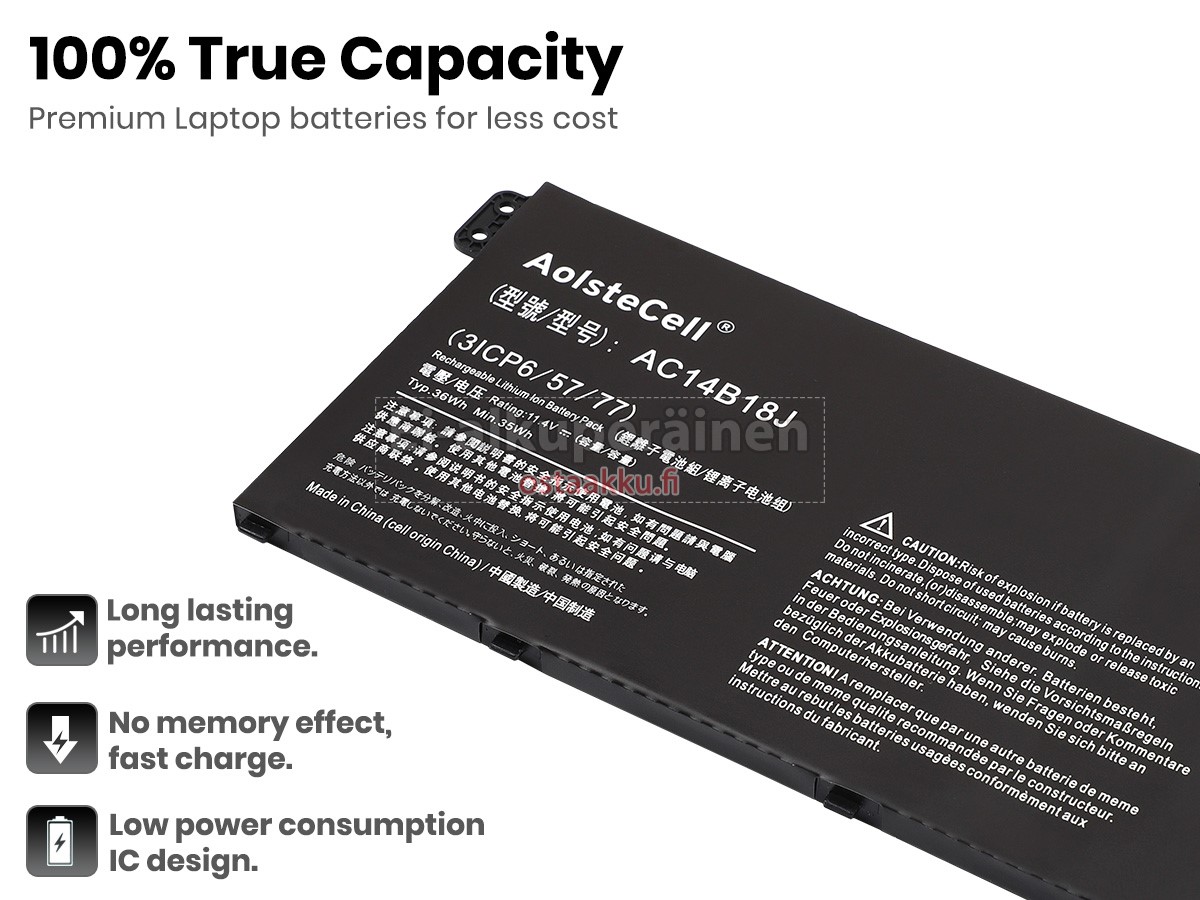Ei muita eroja, paitsi ilman akku tuotemerkkiä. Kaikki akkuja ovat saatavilla in ostaakku.fi valmiustilassa paristot alkuperäisiä valmistajia. Hyväksyy ytimet ja älykäs soluja, kuten alkuperäisiä valmistajia, joten suorituskyky ja yhteensopivuus Acer Aspire 3 A315-54-593C akku on samanlainen kuin alkuperäisen akku ja paremmin. Tämä vähentää palkkion brändistä, varmistaa laadun. Monet asiakkaat ajattelevat, että alkuperäinen akku on parempi suorituskyky. Itse asiassa, kannettavani akkuja tuotemerkkejä ovat myös monet kolmannen osapuolen komponentteja (kuten Samsung, LG, jne). Kuten Kannettavani keskusyksikkö, brändin oma tietokoneyritys ei ole sitä kehittänyt.