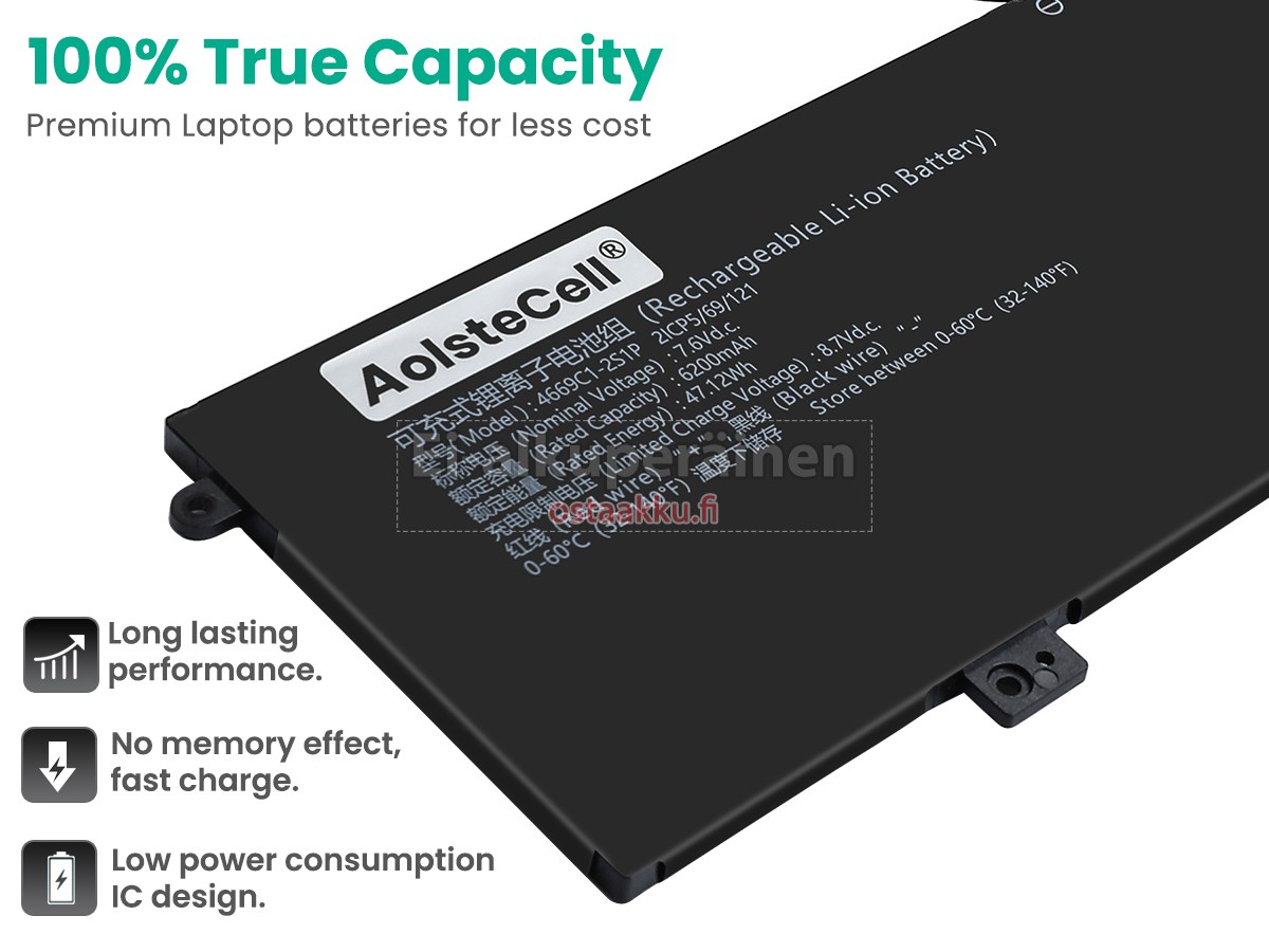 Vaihdettava akku AolsteCell 4669C1-2S1P on uusi. Ehdottomasti ei myydä käytettyjä akku tai uudistettu. Akut ovat valmistettu parhaista solujen ja komponentteja.