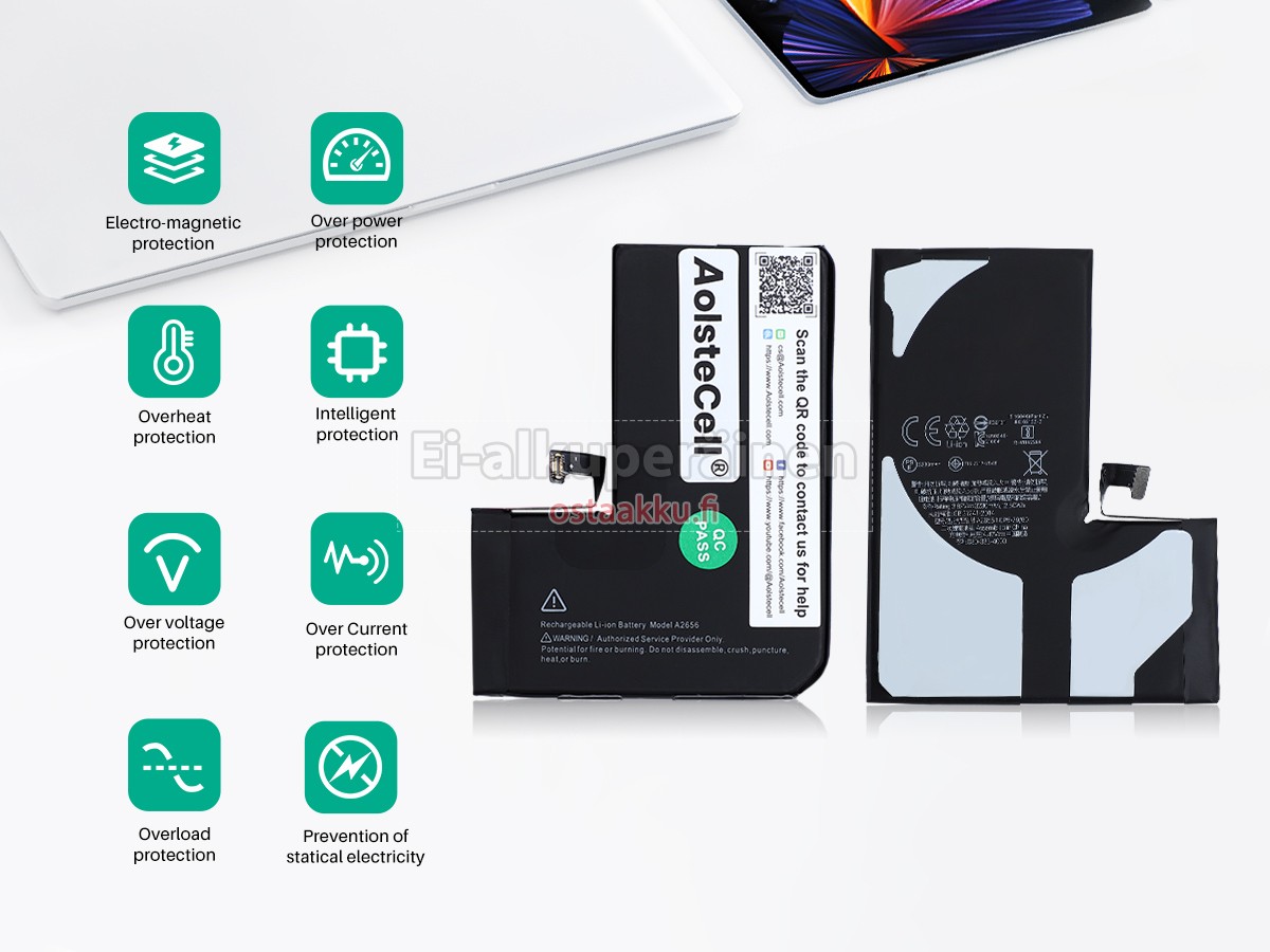 Varaenergian akku uusi Apple A2656 valmistetaan hienoimmista solujen ja komponentteja. Apple A2656 akku säädetään in abc.com hyväksytyn UN38.3, RCM, CE, UL, ROHS, ISO9001/ISO9002 ja muiden kansainvälisten sertifiointia. Jotta voidaan minimoida mahdollinen turvallisuusriski ja varmistaa hyvän käyttäjäkokemuksen, tarjotaan erilaisia suojatoimia Apple A2656 akku kuten lämpösuojaus, virtapiirin suojaus, ylijännitesuojaus, laitteiston suojaus ja kynnyksen lähtövirran.