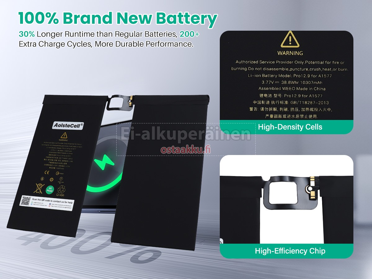Ei muita eroja, paitsi ilman akku tuotemerkkiä. Kaikki akkuja ovat saatavilla in ostaakku.fi valmiustilassa paristot alkuperäisiä valmistajia. Hyväksyy ytimet ja älykäs soluja, kuten alkuperäisiä valmistajia, joten suorituskyky ja yhteensopivuus Apple iPad Pro 12.9 inch 1ST GEN akku on samanlainen kuin alkuperäisen akku ja paremmin. Tämä vähentää palkkion brändistä, varmistaa laadun. Monet asiakkaat ajattelevat, että alkuperäinen akku on parempi suorituskyky. Itse asiassa, kannettavani akkuja tuotemerkkejä ovat myös monet kolmannen osapuolen komponentteja (kuten Samsung, LG, jne). Kuten Kannettavani keskusyksikkö, brändin oma tietokoneyritys ei ole sitä kehittänyt.