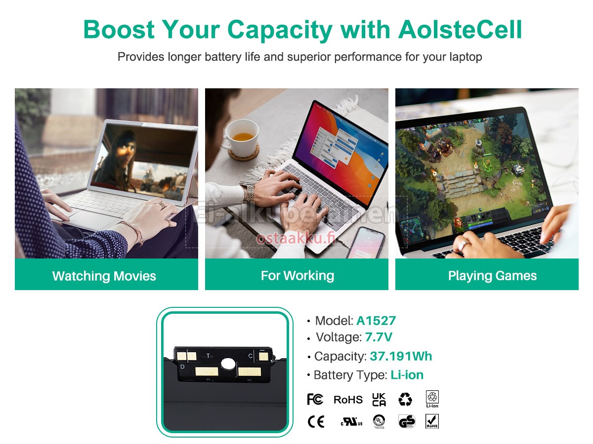 Vaihdettava akku Apple MacBook 12 inch Retina A1534(Mid 2017) on uusi. Ehdottomasti ei myydä käytettyjä akku tai uudistettu. Akut ovat valmistettu parhaista solujen ja komponentteja.