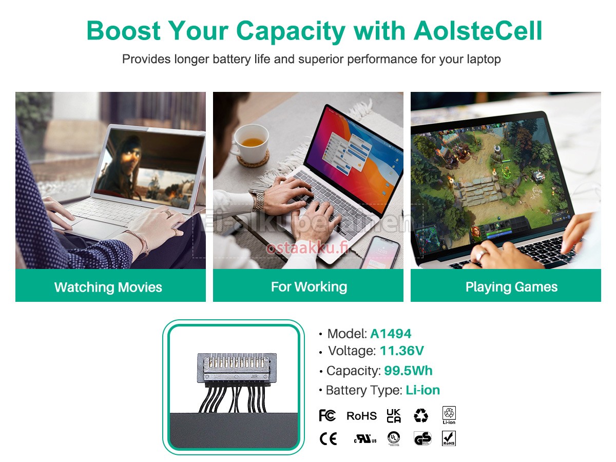 Varaenergian akku uusi Apple MacBook Pro 15.4 inch Retina A1398(Mid 2014) valmistetaan hienoimmista solujen ja komponentteja. Apple MacBook Pro 15.4 inch Retina A1398(Mid 2014) akku säädetään in abc.com hyväksytyn UN38.3, RCM, CE, UL, ROHS, ISO9001/ISO9002 ja muiden kansainvälisten sertifiointia. Jotta voidaan minimoida mahdollinen turvallisuusriski ja varmistaa hyvän käyttäjäkokemuksen, tarjotaan erilaisia suojatoimia Apple MacBook Pro 15.4 inch Retina A1398(Mid 2014) Kannettavani akku kuten lämpösuojaus, virtapiirin suojaus, ylijännitesuojaus, laitteiston suojaus ja kynnyksen lähtövirran.