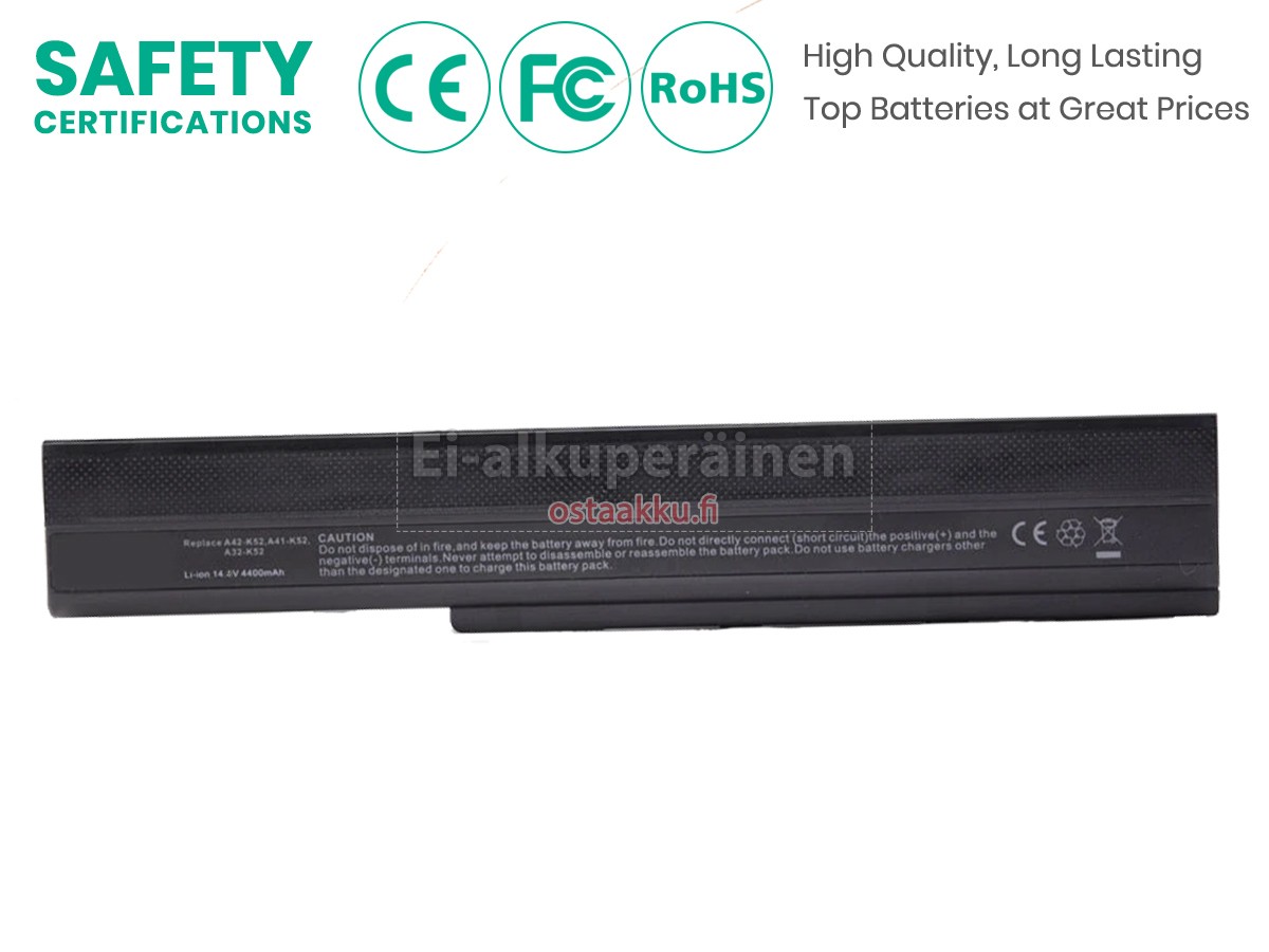 Varaenergian akku uusi Asus A31-K52 valmistetaan hienoimmista solujen ja komponentteja. Asus A31-K52 akku säädetään in abc.com hyväksytyn UN38.3, RCM, CE, UL, ROHS, ISO9001/ISO9002 ja muiden kansainvälisten sertifiointia. Jotta voidaan minimoida mahdollinen turvallisuusriski ja varmistaa hyvän käyttäjäkokemuksen, tarjotaan erilaisia suojatoimia Asus A31-K52 Kannettavani akku kuten lämpösuojaus, virtapiirin suojaus, ylijännitesuojaus, laitteiston suojaus ja kynnyksen lähtövirran.