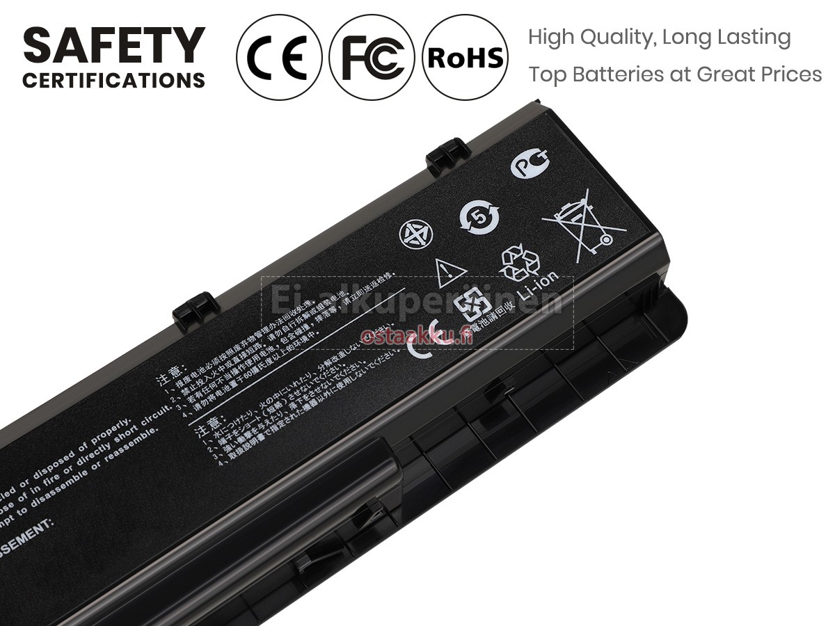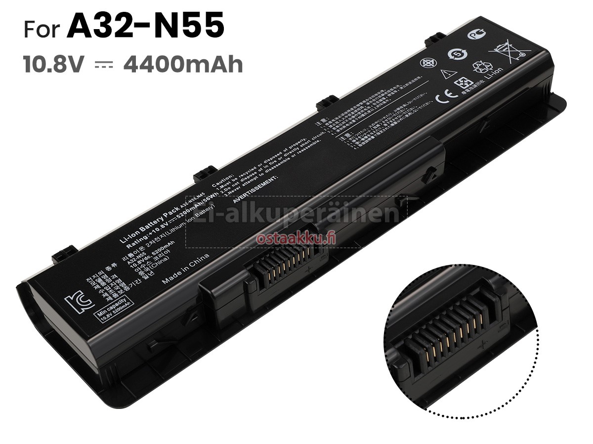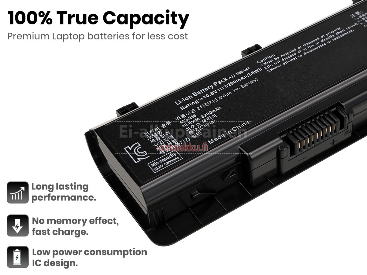 Varaenergian akku uusi Asus A32-N55 valmistetaan hienoimmista solujen ja komponentteja. Asus A32-N55 akku säädetään in abc.com hyväksytyn UN38.3, RCM, CE, UL, ROHS, ISO9001/ISO9002 ja muiden kansainvälisten sertifiointia. Jotta voidaan minimoida mahdollinen turvallisuusriski ja varmistaa hyvän käyttäjäkokemuksen, tarjotaan erilaisia suojatoimia Asus A32-N55 Kannettavani akku kuten lämpösuojaus, virtapiirin suojaus, ylijännitesuojaus, laitteiston suojaus ja kynnyksen lähtövirran.