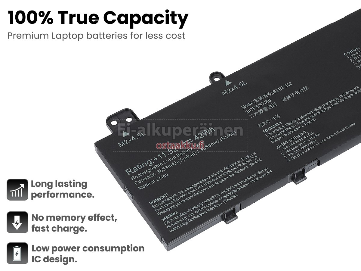 Vaihdettava akku Asus B31N1902 on uusi. Ehdottomasti ei myydä käytettyjä akku tai uudistettu. Akut ovat valmistettu parhaista solujen ja komponentteja.