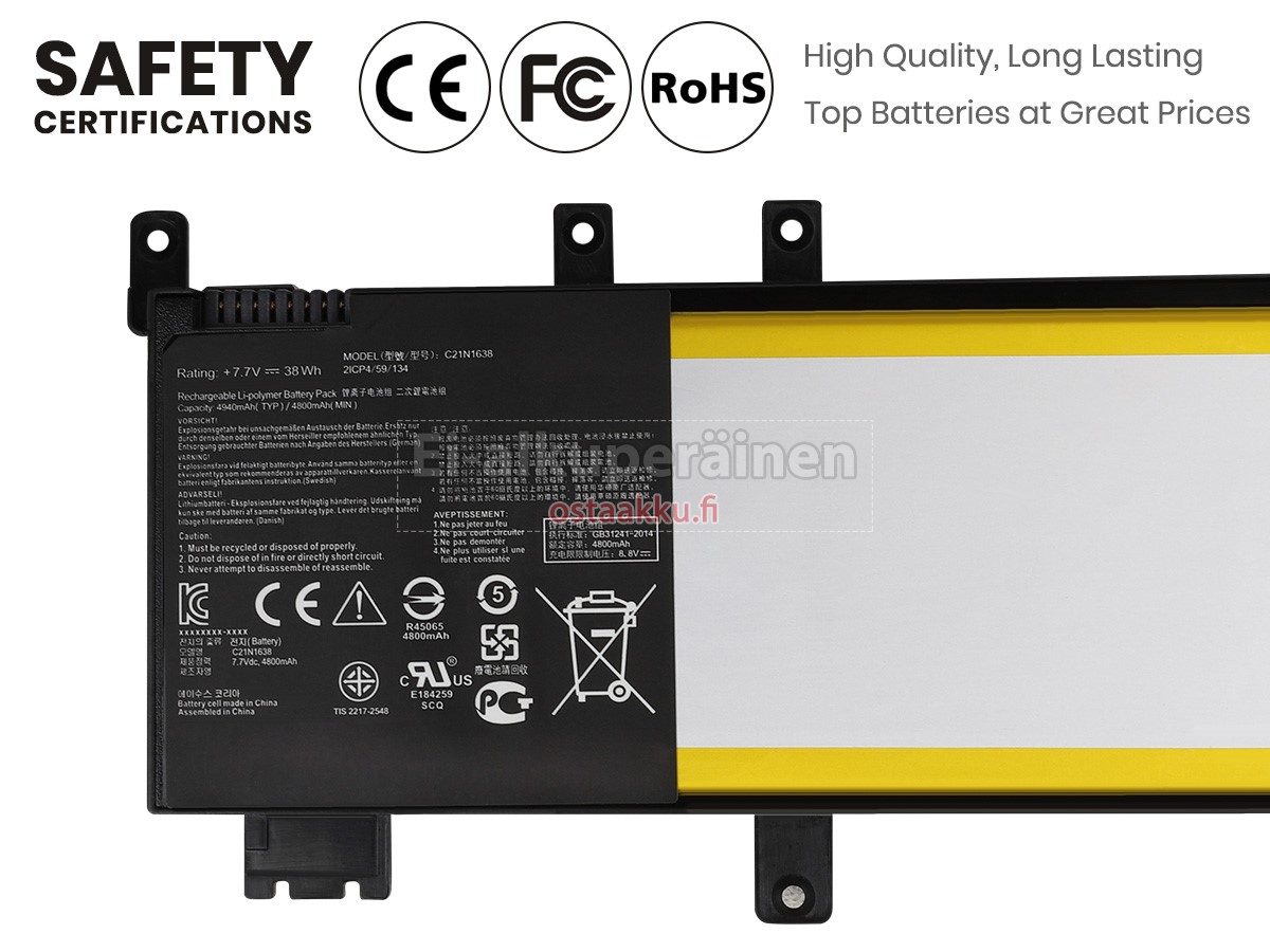 Vaihdettava akku Asus C21N1638 on uusi. Ehdottomasti ei myydä käytettyjä akku tai uudistettu. Akut ovat valmistettu parhaista solujen ja komponentteja.