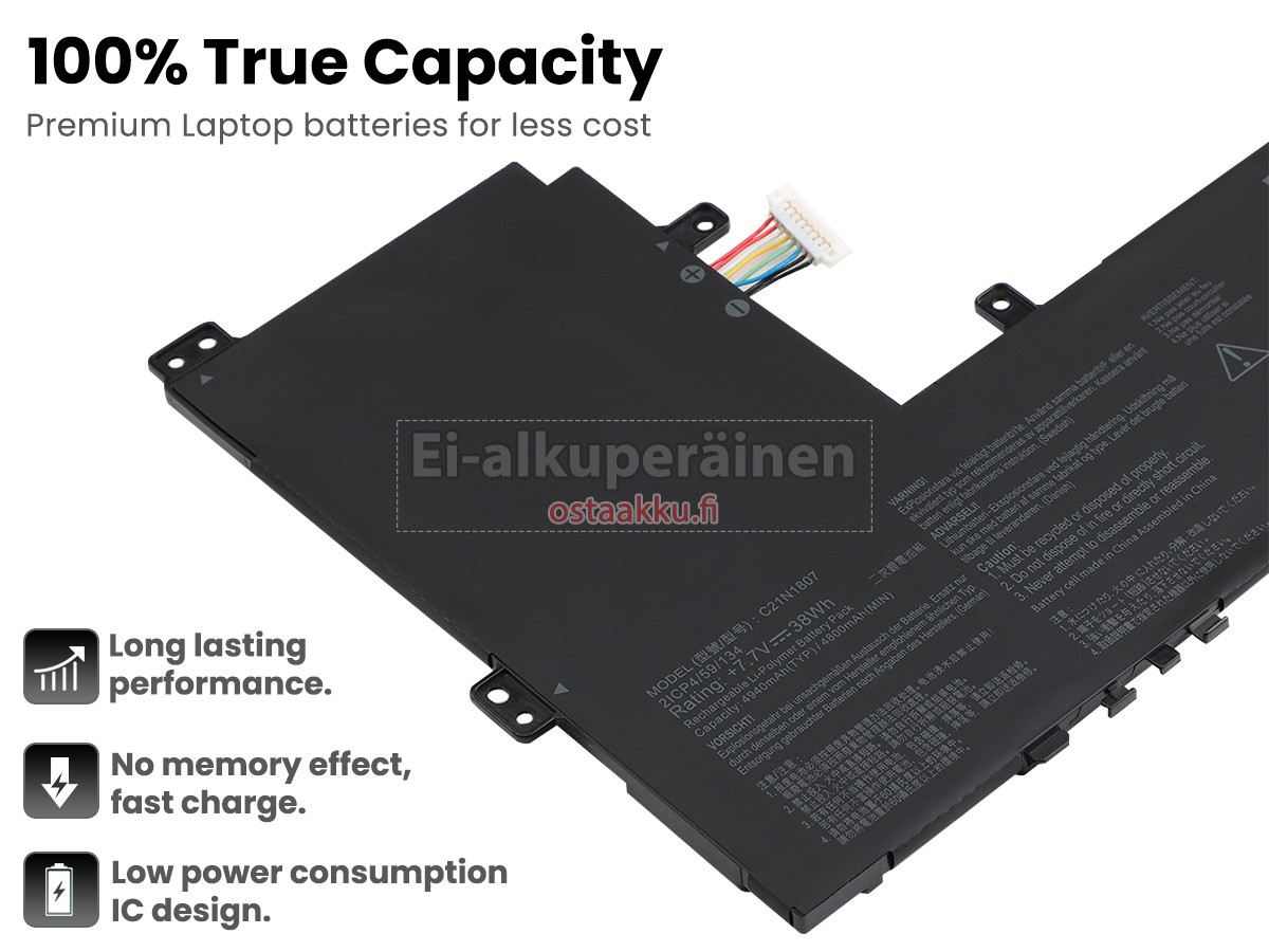 Ei muita eroja, paitsi ilman akku tuotemerkkiä. Kaikki akkuja ovat saatavilla in ostaakku.fi valmiustilassa paristot alkuperäisiä valmistajia. Hyväksyy ytimet ja älykäs soluja, kuten alkuperäisiä valmistajia, joten suorituskyky ja yhteensopivuus Asus C21N1807 akku on samanlainen kuin alkuperäisen akku ja paremmin. Tämä vähentää palkkion brändistä, varmistaa laadun. Monet asiakkaat ajattelevat, että alkuperäinen akku on parempi suorituskyky. Itse asiassa, kannettavani akkuja tuotemerkkejä ovat myös monet kolmannen osapuolen komponentteja (kuten Samsung, LG, jne). Kuten Kannettavani keskusyksikkö, brändin oma tietokoneyritys ei ole sitä kehittänyt.