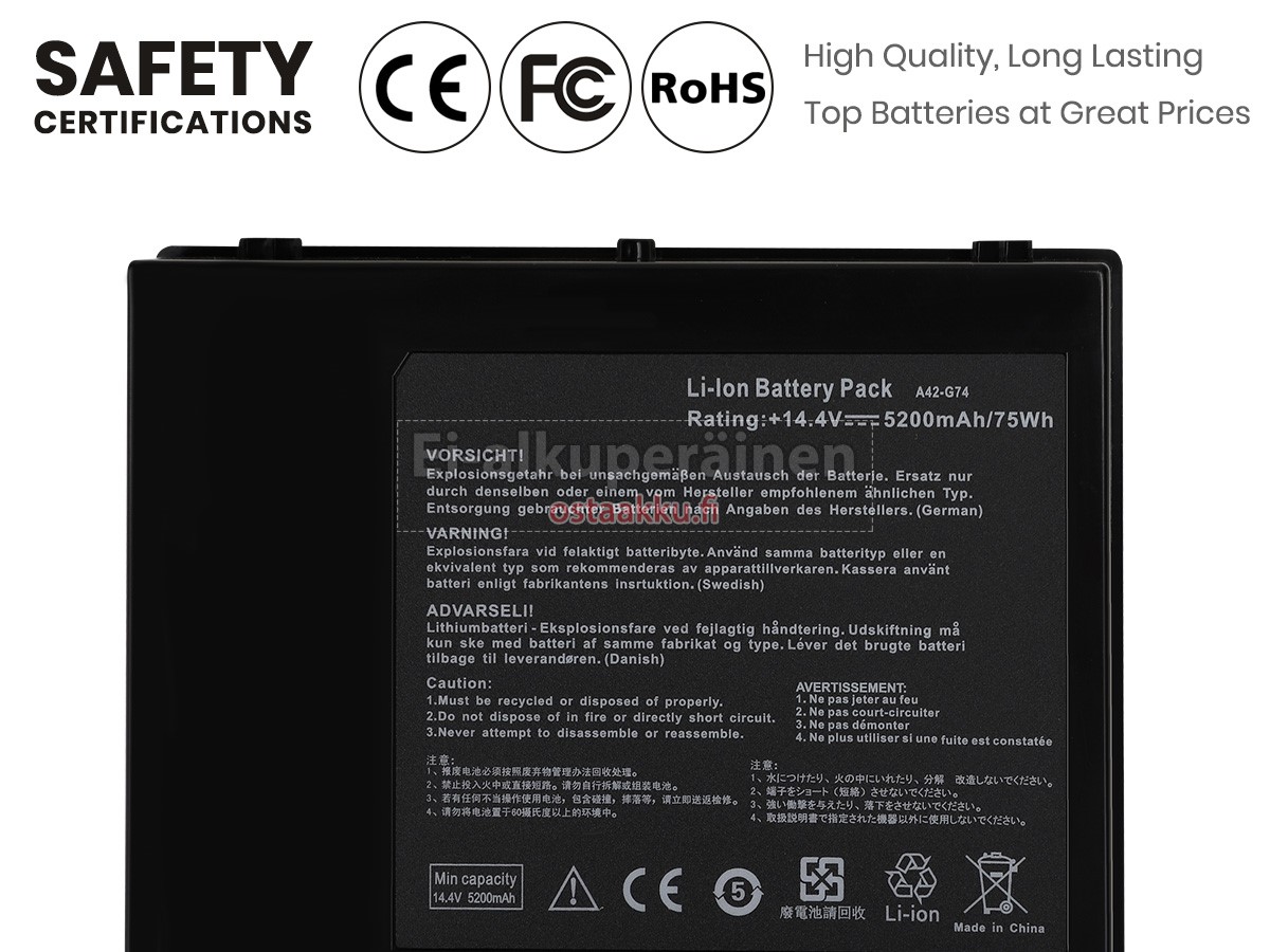 Varaenergian akku uusi Asus G74SX-XR1 valmistetaan hienoimmista solujen ja komponentteja. Asus G74SX-XR1 akku säädetään in abc.com hyväksytyn UN38.3, RCM, CE, UL, ROHS, ISO9001/ISO9002 ja muiden kansainvälisten sertifiointia. Jotta voidaan minimoida mahdollinen turvallisuusriski ja varmistaa hyvän käyttäjäkokemuksen, tarjotaan erilaisia suojatoimia Asus G74SX-XR1 Kannettavani akku kuten lämpösuojaus, virtapiirin suojaus, ylijännitesuojaus, laitteiston suojaus ja kynnyksen lähtövirran.