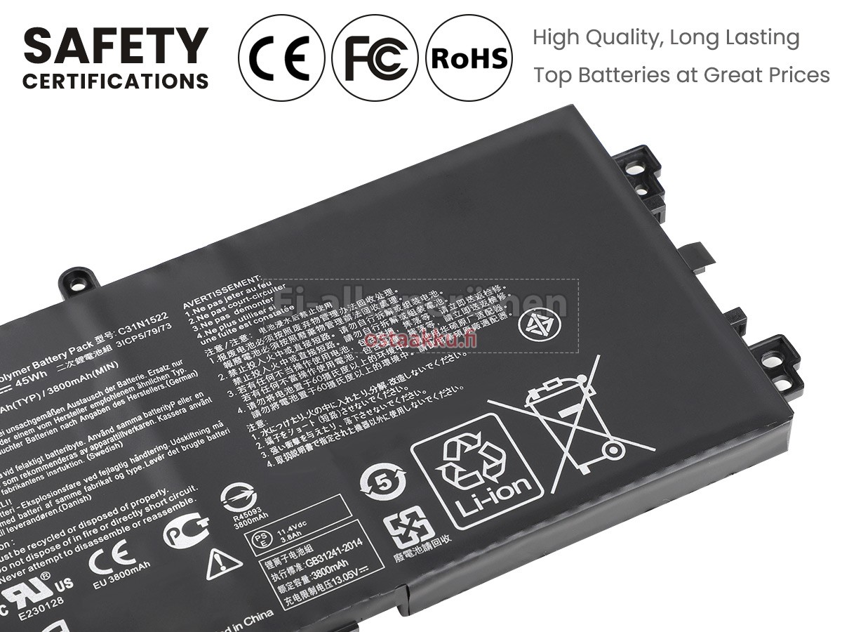 Varaenergian akku uusi Asus N593UB valmistetaan hienoimmista solujen ja komponentteja. Asus N593UB akku säädetään in abc.com hyväksytyn UN38.3, RCM, CE, UL, ROHS, ISO9001/ISO9002 ja muiden kansainvälisten sertifiointia. Jotta voidaan minimoida mahdollinen turvallisuusriski ja varmistaa hyvän käyttäjäkokemuksen, tarjotaan erilaisia suojatoimia Asus N593UB Kannettavani akku kuten lämpösuojaus, virtapiirin suojaus, ylijännitesuojaus, laitteiston suojaus ja kynnyksen lähtövirran.