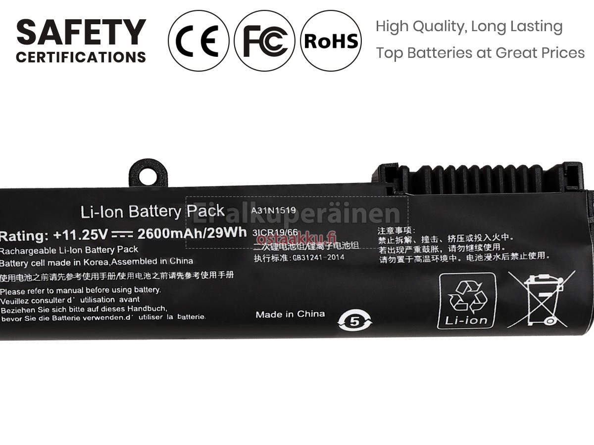 Varaenergian akku uusi Asus X540SC valmistetaan hienoimmista solujen ja komponentteja. Asus X540SC akku säädetään in abc.com hyväksytyn UN38.3, RCM, CE, UL, ROHS, ISO9001/ISO9002 ja muiden kansainvälisten sertifiointia. Jotta voidaan minimoida mahdollinen turvallisuusriski ja varmistaa hyvän käyttäjäkokemuksen, tarjotaan erilaisia suojatoimia Asus X540SC Kannettavani akku kuten lämpösuojaus, virtapiirin suojaus, ylijännitesuojaus, laitteiston suojaus ja kynnyksen lähtövirran.