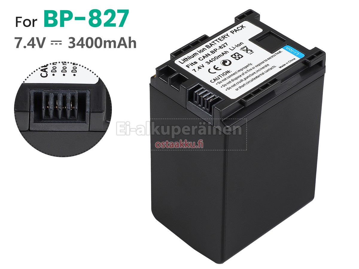 Varaenergian akku uusi Canon BP-827 valmistetaan hienoimmista solujen ja komponentteja. Canon BP-827 akku säädetään in abc.com hyväksytyn UN38.3, RCM, CE, UL, ROHS, ISO9001/ISO9002 ja muiden kansainvälisten sertifiointia. Jotta voidaan minimoida mahdollinen turvallisuusriski ja varmistaa hyvän käyttäjäkokemuksen, tarjotaan erilaisia suojatoimia Canon BP-827 akku kuten lämpösuojaus, virtapiirin suojaus, ylijännitesuojaus, laitteiston suojaus ja kynnyksen lähtövirran.
