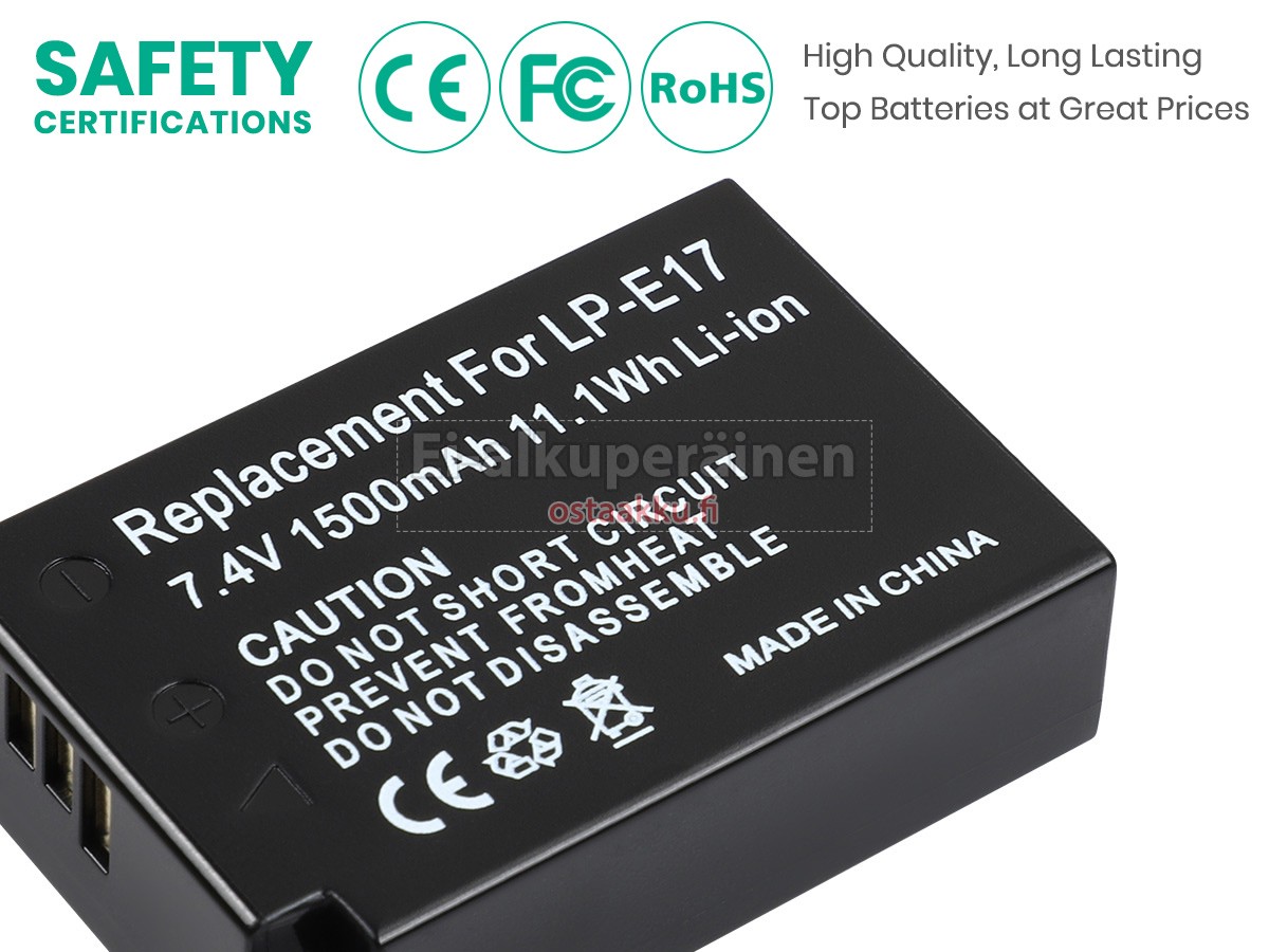 Varaenergian akku uusi Canon EOS M5 valmistetaan hienoimmista solujen ja komponentteja. Canon EOS M5 akku säädetään in abc.com hyväksytyn UN38.3, RCM, CE, UL, ROHS, ISO9001/ISO9002 ja muiden kansainvälisten sertifiointia. Jotta voidaan minimoida mahdollinen turvallisuusriski ja varmistaa hyvän käyttäjäkokemuksen, tarjotaan erilaisia suojatoimia Canon EOS M5 akku kuten lämpösuojaus, virtapiirin suojaus, ylijännitesuojaus, laitteiston suojaus ja kynnyksen lähtövirran.
