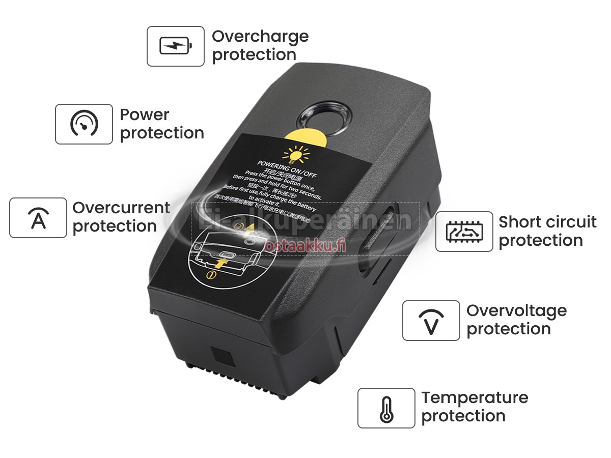Varaenergian akku uusi DJI MAVIC 2 valmistetaan hienoimmista solujen ja komponentteja. DJI MAVIC 2 akku säädetään in abc.com hyväksytyn UN38.3, RCM, CE, UL, ROHS, ISO9001/ISO9002 ja muiden kansainvälisten sertifiointia. Jotta voidaan minimoida mahdollinen turvallisuusriski ja varmistaa hyvän käyttäjäkokemuksen, tarjotaan erilaisia suojatoimia DJI MAVIC 2 akku kuten lämpösuojaus, virtapiirin suojaus, ylijännitesuojaus, laitteiston suojaus ja kynnyksen lähtövirran.