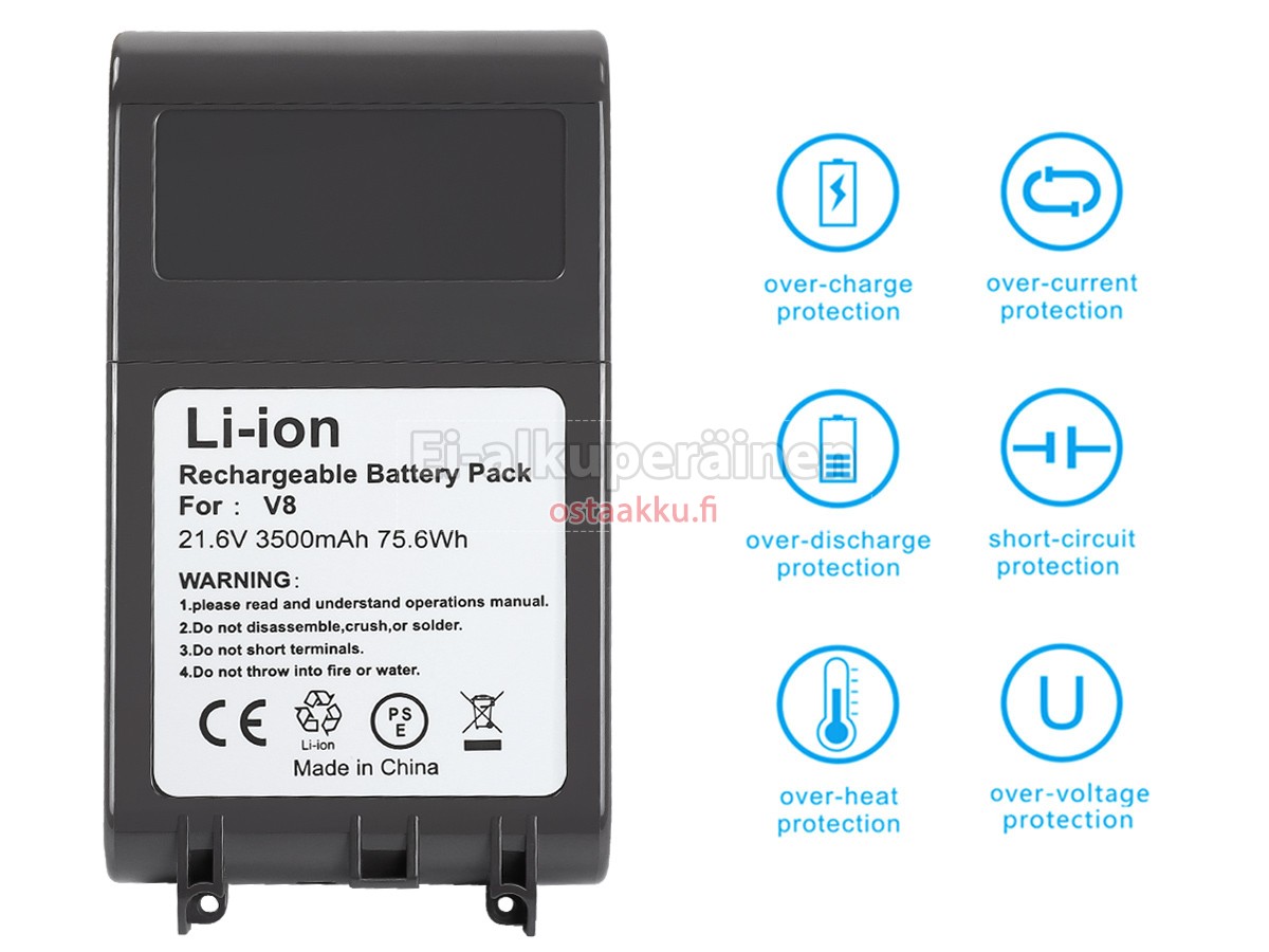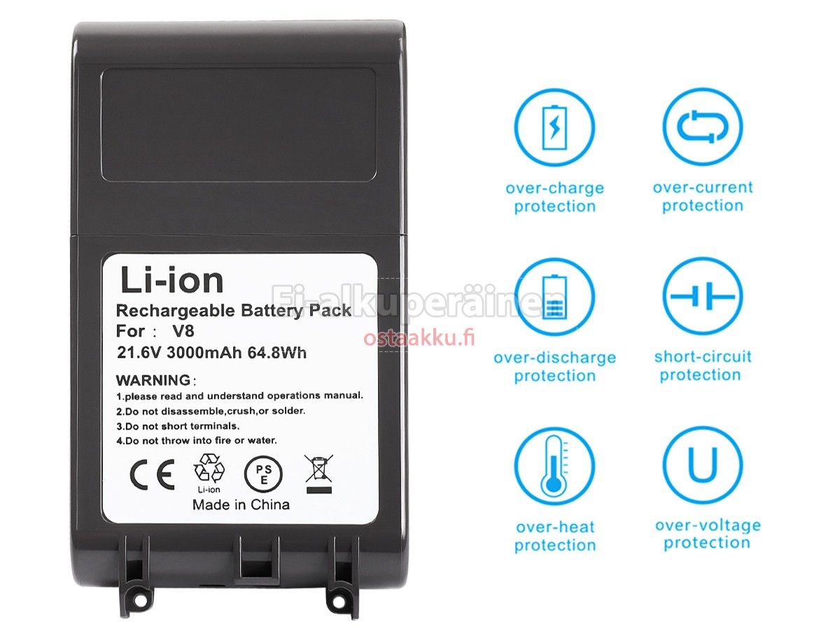 Varaenergian akku uusi Dyson 8895-02 valmistetaan hienoimmista solujen ja komponentteja. Dyson 8895-02 akku säädetään in abc.com hyväksytyn UN38.3, RCM, CE, UL, ROHS, ISO9001/ISO9002 ja muiden kansainvälisten sertifiointia. Jotta voidaan minimoida mahdollinen turvallisuusriski ja varmistaa hyvän käyttäjäkokemuksen, tarjotaan erilaisia suojatoimia Dyson 8895-02 pölynimurin akku kuten lämpösuojaus, virtapiirin suojaus, ylijännitesuojaus, laitteiston suojaus ja kynnyksen lähtövirran.