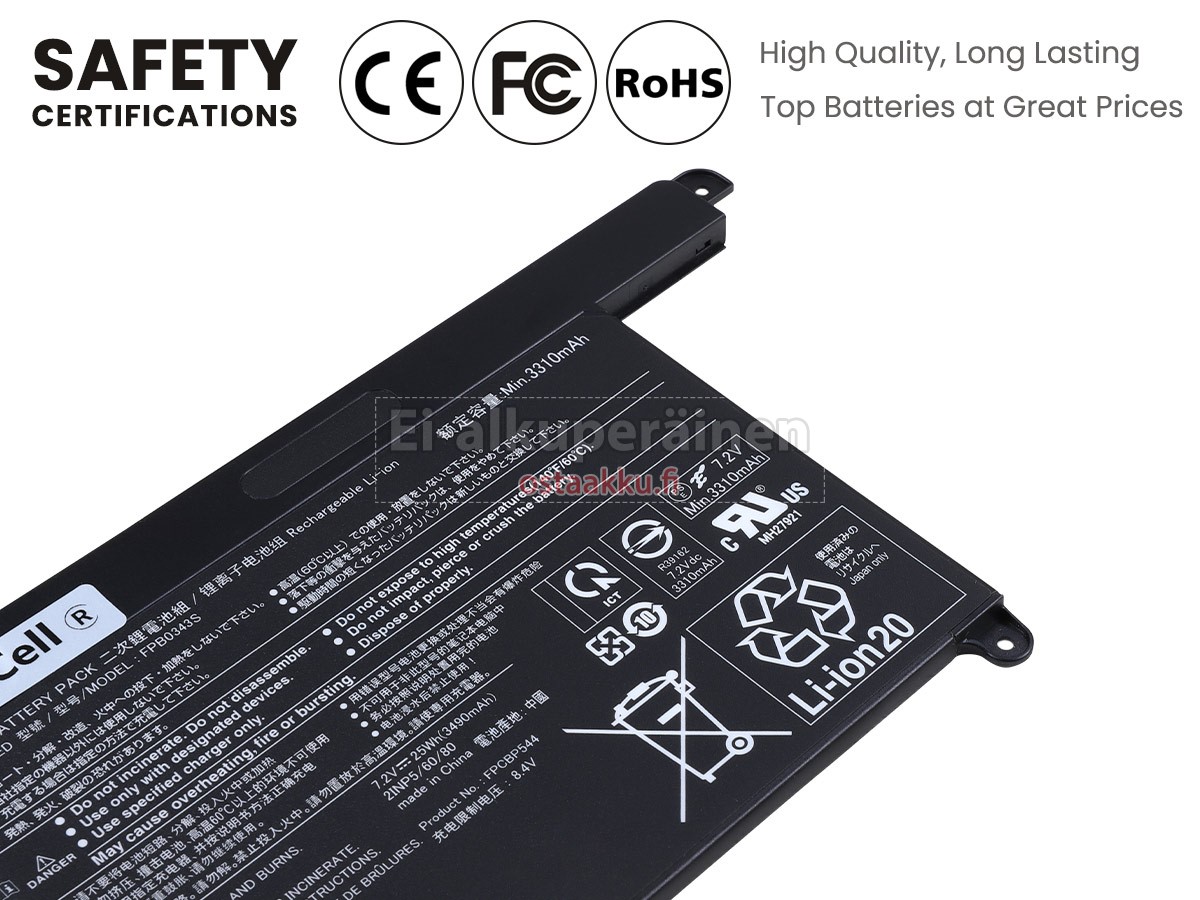 Varaenergian akku uusi Fujitsu FMVU75EUV3 valmistetaan hienoimmista solujen ja komponentteja. Fujitsu FMVU75EUV3 akku säädetään in abc.com hyväksytyn UN38.3, RCM, CE, UL, ROHS, ISO9001/ISO9002 ja muiden kansainvälisten sertifiointia. Jotta voidaan minimoida mahdollinen turvallisuusriski ja varmistaa hyvän käyttäjäkokemuksen, tarjotaan erilaisia suojatoimia Fujitsu FMVU75EUV3 Kannettavani akku kuten lämpösuojaus, virtapiirin suojaus, ylijännitesuojaus, laitteiston suojaus ja kynnyksen lähtövirran.