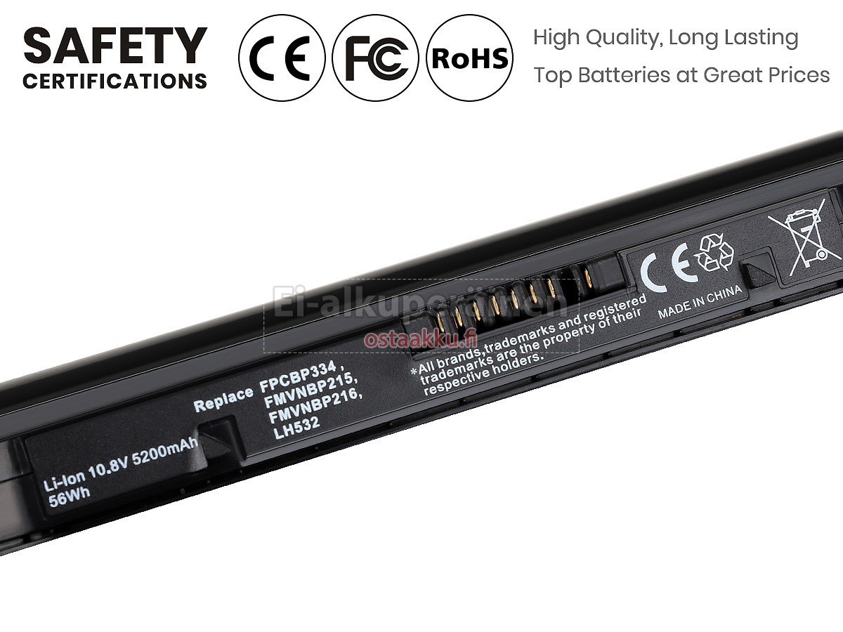 Vaihdettava akku Fujitsu FPCBP334 on uusi. Ehdottomasti ei myydä käytettyjä akku tai uudistettu. Akut ovat valmistettu parhaista solujen ja komponentteja.