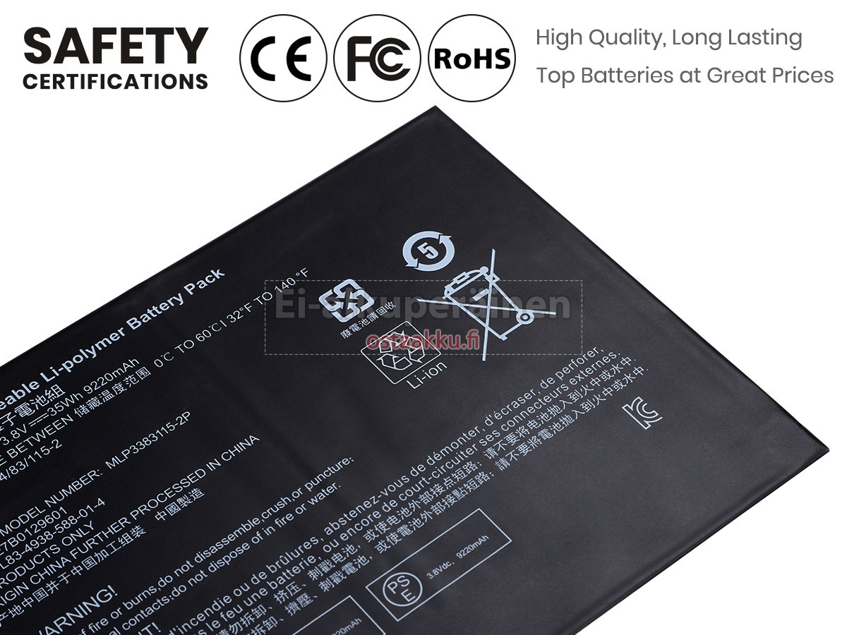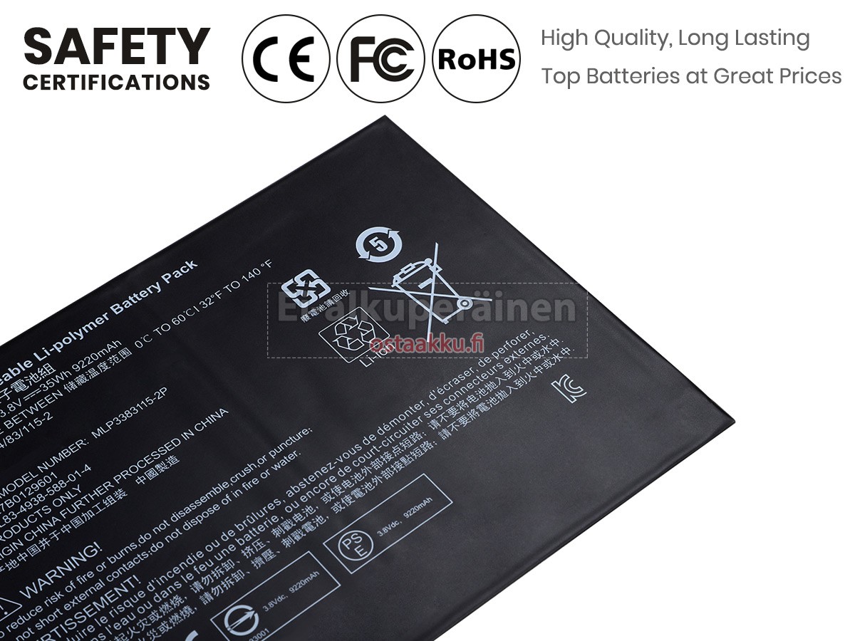 Varaenergian akku uusi HP MLP3383115 valmistetaan hienoimmista solujen ja komponentteja. HP MLP3383115 akku säädetään in abc.com hyväksytyn UN38.3, RCM, CE, UL, ROHS, ISO9001/ISO9002 ja muiden kansainvälisten sertifiointia. Jotta voidaan minimoida mahdollinen turvallisuusriski ja varmistaa hyvän käyttäjäkokemuksen, tarjotaan erilaisia suojatoimia HP MLP3383115 Kannettavani akku kuten lämpösuojaus, virtapiirin suojaus, ylijännitesuojaus, laitteiston suojaus ja kynnyksen lähtövirran.