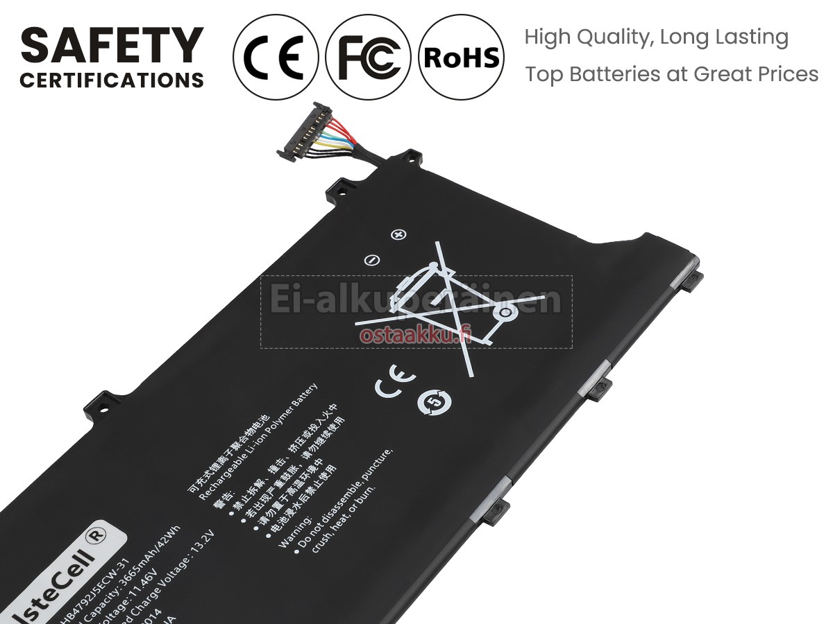 Varaenergian akku uusi Huawei BBR-WAH9 valmistetaan hienoimmista solujen ja komponentteja. Huawei BBR-WAH9 akku säädetään in abc.com hyväksytyn UN38.3, RCM, CE, UL, ROHS, ISO9001/ISO9002 ja muiden kansainvälisten sertifiointia. Jotta voidaan minimoida mahdollinen turvallisuusriski ja varmistaa hyvän käyttäjäkokemuksen, tarjotaan erilaisia suojatoimia Huawei BBR-WAH9 Kannettavani akku kuten lämpösuojaus, virtapiirin suojaus, ylijännitesuojaus, laitteiston suojaus ja kynnyksen lähtövirran.