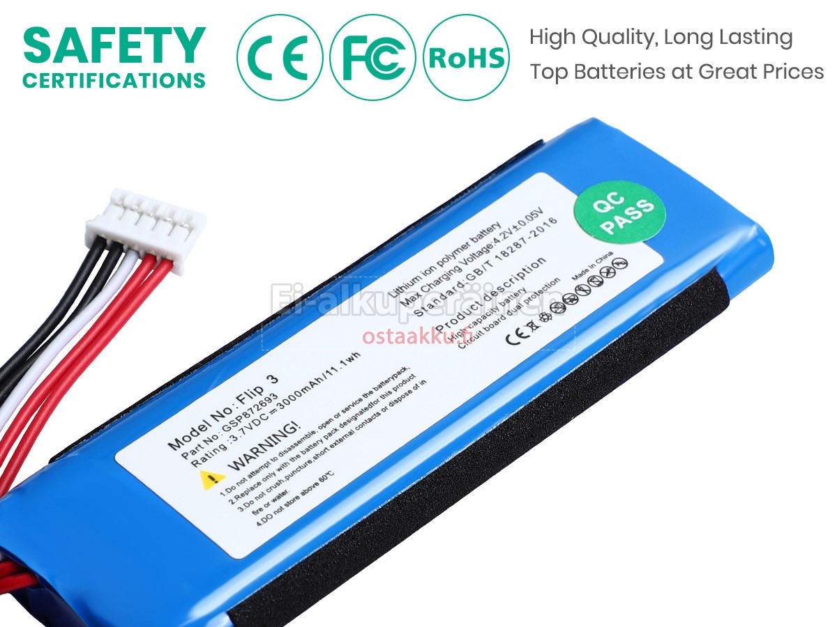 Vaihdettava akku JBL GSP872693 on uusi. Ehdottomasti ei myydä käytettyjä akku tai uudistettu. Akut ovat valmistettu parhaista solujen ja komponentteja.