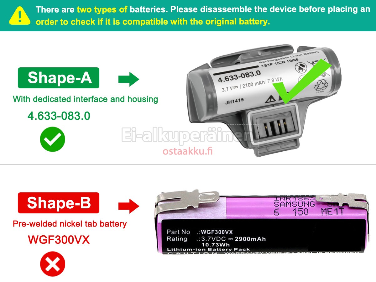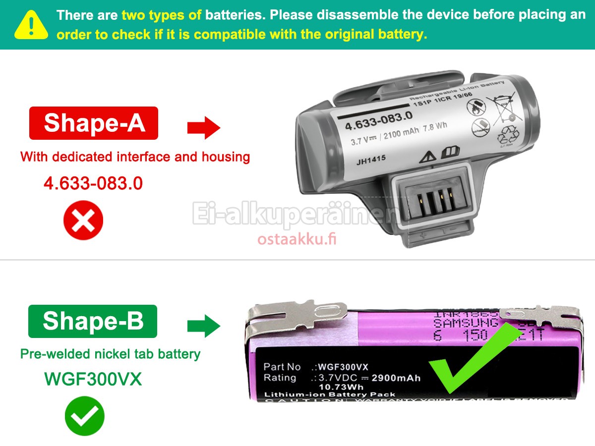 Vaihdettava akku Karcher WV70 PLUS on uusi. Ehdottomasti ei myydä käytettyjä akku tai uudistettu. Akut ovat valmistettu parhaista solujen ja komponentteja.