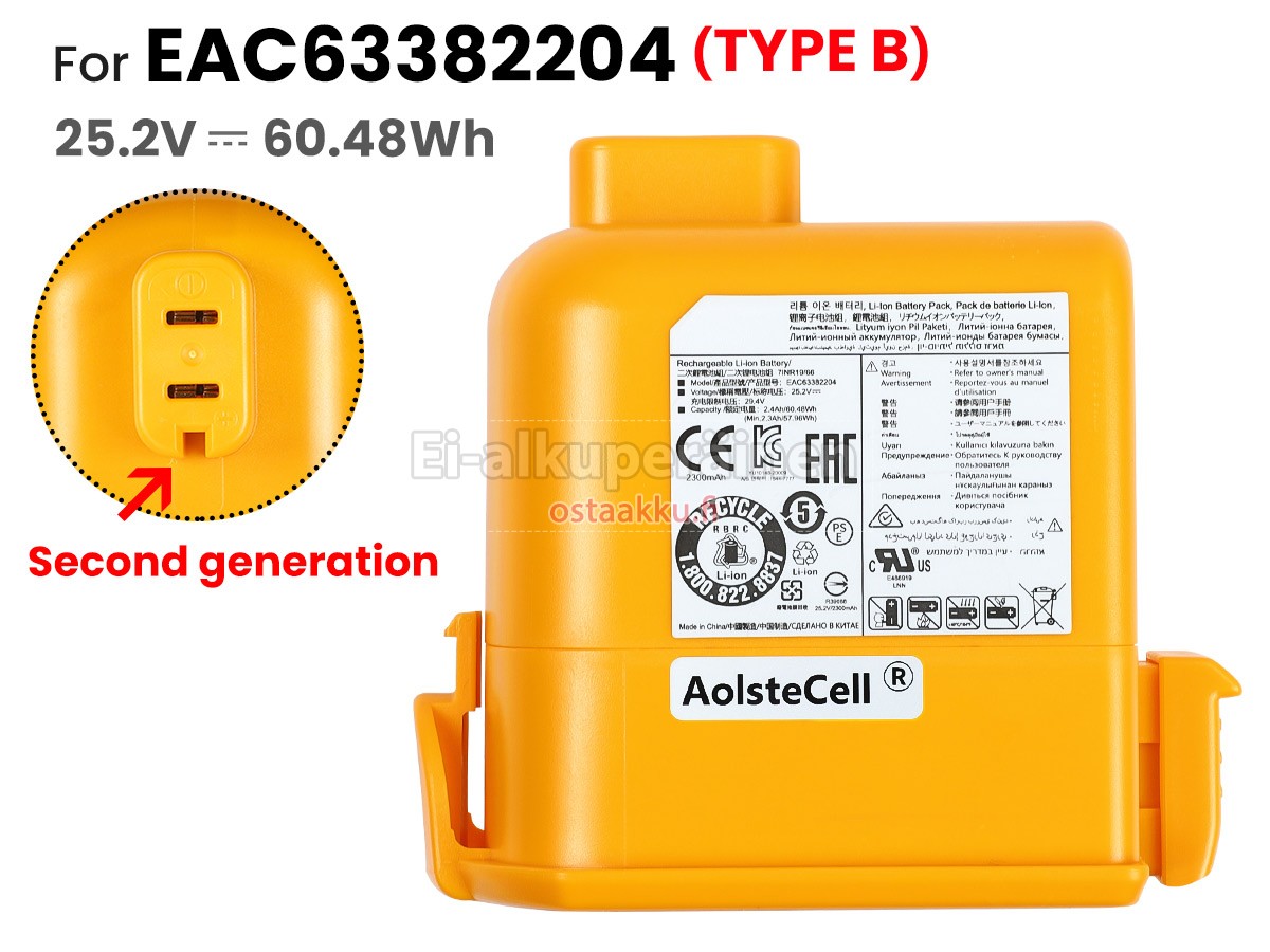 Varaenergian akku uusi LG EAC63382201 valmistetaan hienoimmista solujen ja komponentteja. LG EAC63382201 akku säädetään in abc.com hyväksytyn UN38.3, RCM, CE, UL, ROHS, ISO9001/ISO9002 ja muiden kansainvälisten sertifiointia. Jotta voidaan minimoida mahdollinen turvallisuusriski ja varmistaa hyvän käyttäjäkokemuksen, tarjotaan erilaisia suojatoimia LG EAC63382201 pölynimurin akku kuten lämpösuojaus, virtapiirin suojaus, ylijännitesuojaus, laitteiston suojaus ja kynnyksen lähtövirran.