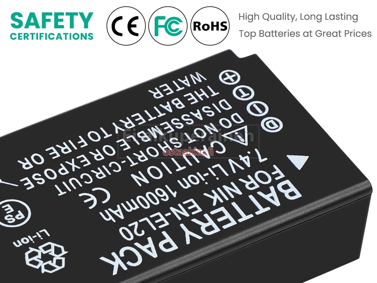 Varaenergian akku uusi Nikon EN-EL20 valmistetaan hienoimmista solujen ja komponentteja. Nikon EN-EL20 akku säädetään in abc.com hyväksytyn UN38.3, RCM, CE, UL, ROHS, ISO9001/ISO9002 ja muiden kansainvälisten sertifiointia. Jotta voidaan minimoida mahdollinen turvallisuusriski ja varmistaa hyvän käyttäjäkokemuksen, tarjotaan erilaisia suojatoimia Nikon EN-EL20 akku kuten lämpösuojaus, virtapiirin suojaus, ylijännitesuojaus, laitteiston suojaus ja kynnyksen lähtövirran.