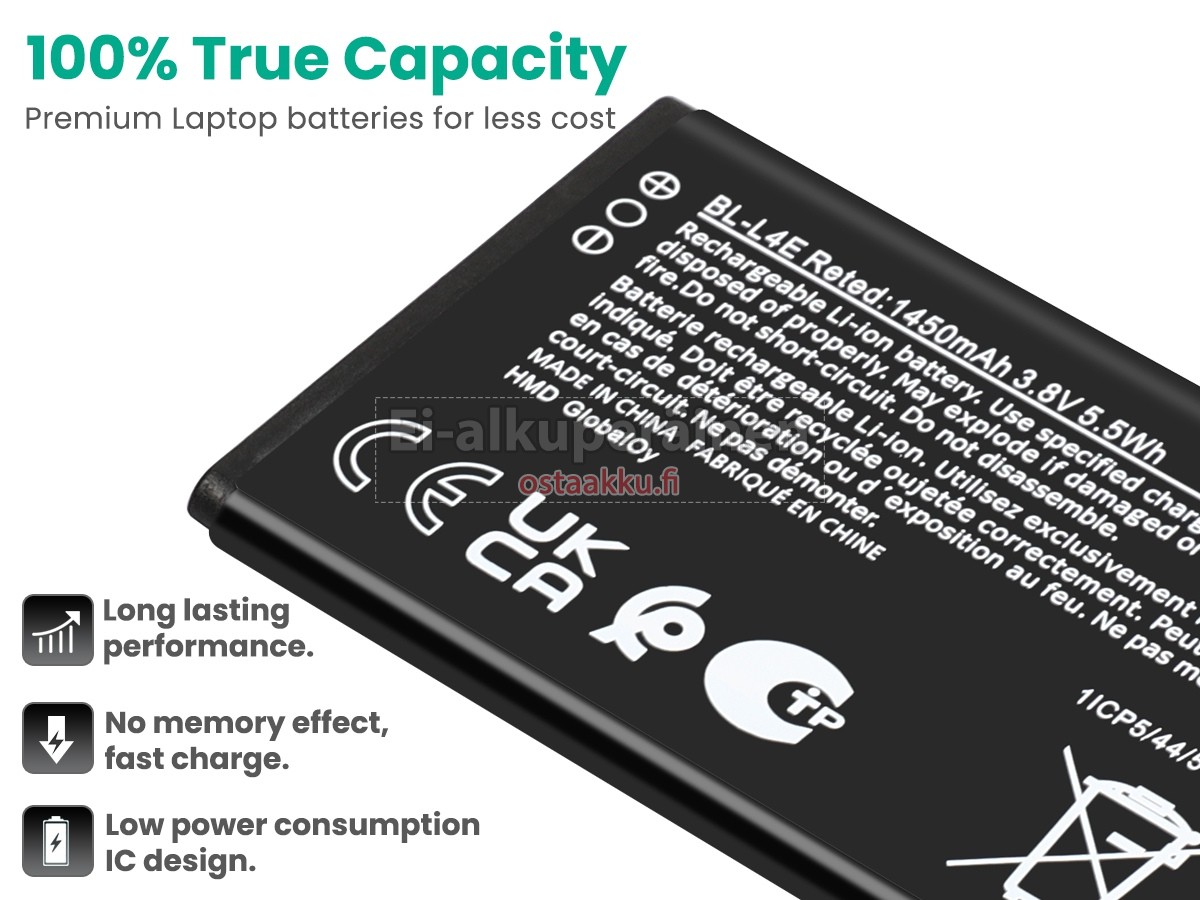 Vaihdettava akku Nokia BL-L4E on uusi. Ehdottomasti ei myydä käytettyjä akku tai uudistettu. Akut ovat valmistettu parhaista solujen ja komponentteja.