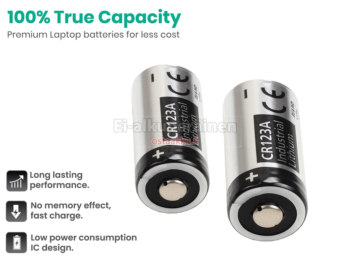 Ei muita eroja, paitsi ilman akku tuotemerkkiä. Kaikki akkuja ovat saatavilla in ostaakku.fi valmiustilassa paristot alkuperäisiä valmistajia. Hyväksyy ytimet ja älykäs soluja, kuten alkuperäisiä valmistajia, joten suorituskyky ja yhteensopivuus Panasonic CR123A akku on samanlainen kuin alkuperäisen akku ja paremmin. Tämä vähentää palkkion brändistä, varmistaa laadun. Monet asiakkaat ajattelevat, että alkuperäinen akku on parempi suorituskyky. Itse asiassa, akkuja tuotemerkkejä ovat myös monet kolmannen osapuolen komponentteja (kuten Samsung, LG, jne). Kuten keskusyksikkö, brändin oma tietokoneyritys ei ole sitä kehittänyt.