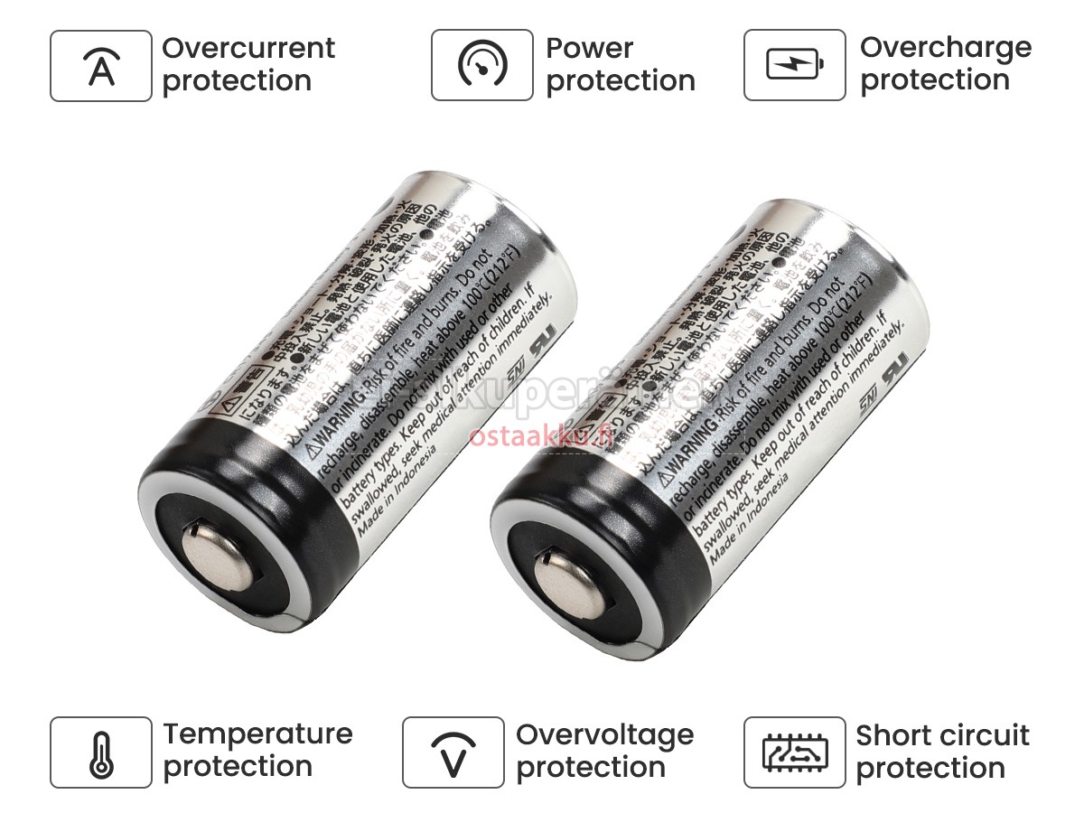 Varaenergian akku uusi Panasonic CR123A valmistetaan hienoimmista solujen ja komponentteja. Panasonic CR123A akku säädetään in abc.com hyväksytyn UN38.3, RCM, CE, UL, ROHS, ISO9001/ISO9002 ja muiden kansainvälisten sertifiointia. Jotta voidaan minimoida mahdollinen turvallisuusriski ja varmistaa hyvän käyttäjäkokemuksen, tarjotaan erilaisia suojatoimia Panasonic CR123A akku kuten lämpösuojaus, virtapiirin suojaus, ylijännitesuojaus, laitteiston suojaus ja kynnyksen lähtövirran.