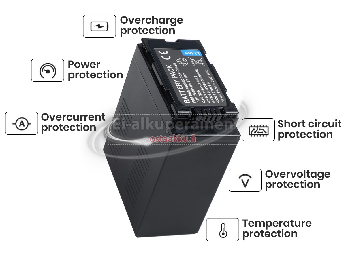 Varaenergian akku uusi Panasonic NV-EX3EG valmistetaan hienoimmista solujen ja komponentteja. Panasonic NV-EX3EG akku säädetään in abc.com hyväksytyn UN38.3, RCM, CE, UL, ROHS, ISO9001/ISO9002 ja muiden kansainvälisten sertifiointia. Jotta voidaan minimoida mahdollinen turvallisuusriski ja varmistaa hyvän käyttäjäkokemuksen, tarjotaan erilaisia suojatoimia Panasonic NV-EX3EG akku kuten lämpösuojaus, virtapiirin suojaus, ylijännitesuojaus, laitteiston suojaus ja kynnyksen lähtövirran.