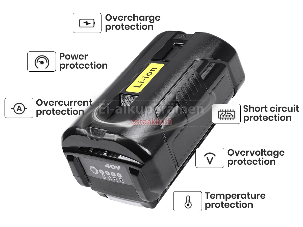 Varaenergian akku uusi Ryobi OP4050A valmistetaan hienoimmista solujen ja komponentteja. Ryobi OP4050A akku säädetään in abc.com hyväksytyn UN38.3, RCM, CE, UL, ROHS, ISO9001/ISO9002 ja muiden kansainvälisten sertifiointia. Jotta voidaan minimoida mahdollinen turvallisuusriski ja varmistaa hyvän käyttäjäkokemuksen, tarjotaan erilaisia suojatoimia Ryobi OP4050A akku kuten lämpösuojaus, virtapiirin suojaus, ylijännitesuojaus, laitteiston suojaus ja kynnyksen lähtövirran.