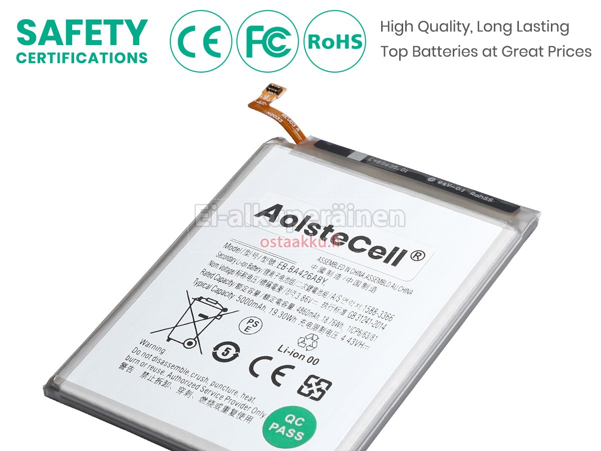 Ei muita eroja, paitsi ilman akku tuotemerkkiä. Kaikki akkuja ovat saatavilla in ostaakku.fi valmiustilassa paristot alkuperäisiä valmistajia. Hyväksyy ytimet ja älykäs soluja, kuten alkuperäisiä valmistajia, joten suorituskyky ja yhteensopivuus Samsung A72 akku on samanlainen kuin alkuperäisen akku ja paremmin. Tämä vähentää palkkion brändistä, varmistaa laadun. Monet asiakkaat ajattelevat, että alkuperäinen akku on parempi suorituskyky. Itse asiassa, akkuja tuotemerkkejä ovat myös monet kolmannen osapuolen komponentteja (kuten Samsung, LG, jne). Kuten keskusyksikkö, brändin oma tietokoneyritys ei ole sitä kehittänyt.