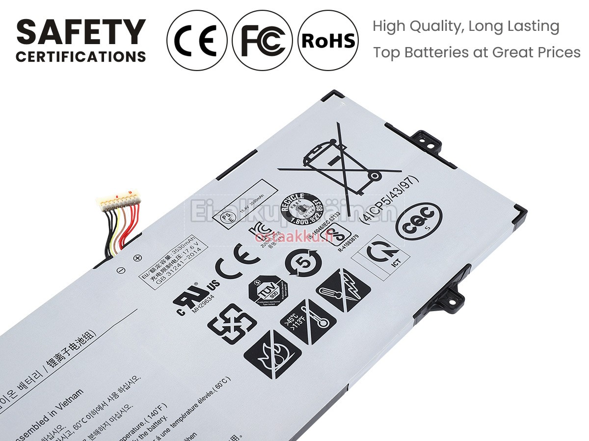 Varaenergian akku uusi Samsung AA-PBSN4AF valmistetaan hienoimmista solujen ja komponentteja. Samsung AA-PBSN4AF akku säädetään in abc.com hyväksytyn UN38.3, RCM, CE, UL, ROHS, ISO9001/ISO9002 ja muiden kansainvälisten sertifiointia. Jotta voidaan minimoida mahdollinen turvallisuusriski ja varmistaa hyvän käyttäjäkokemuksen, tarjotaan erilaisia suojatoimia Samsung AA-PBSN4AF Kannettavani akku kuten lämpösuojaus, virtapiirin suojaus, ylijännitesuojaus, laitteiston suojaus ja kynnyksen lähtövirran.