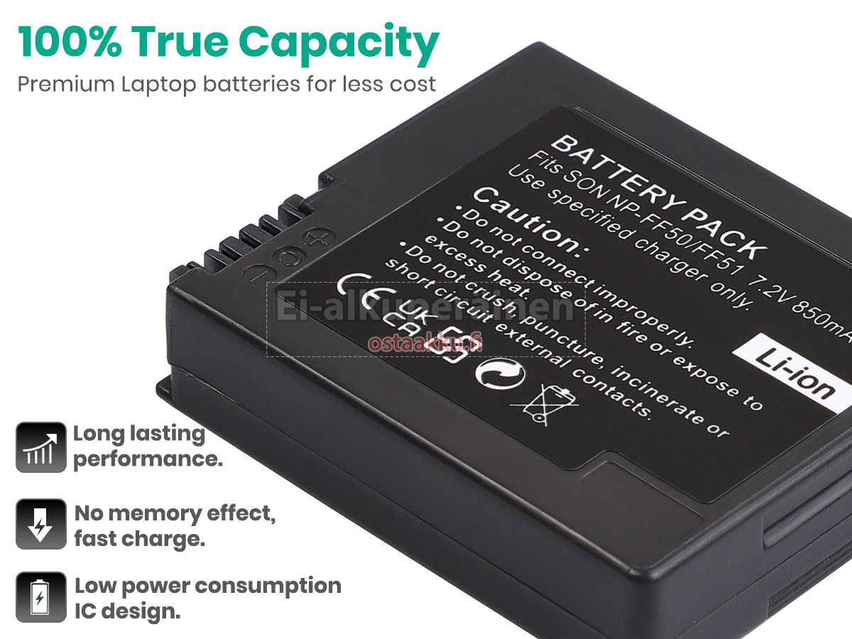 Vaihdettava akku Sony NP-FF50 on uusi. Ehdottomasti ei myydä käytettyjä akku tai uudistettu. Akut ovat valmistettu parhaista solujen ja komponentteja.