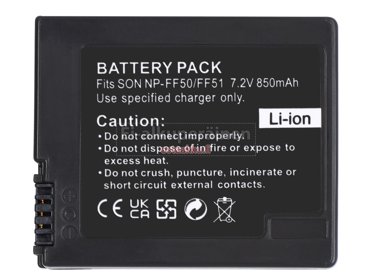 Ei ole suositeltavaa irrottaa akku, jotta voimme jatkaa toimintaansa ja et menetä tietoja äkillisen sähkökatkoksen. Jos haluat poistaa, on suositeltavaa pakata Sony NP-FF50 akun muovilla ja laita se kuivassa, viileässä paikassa, ja muista käyttää ja ladata akku vähintään kerran kuukaudessa, jotta vältetään aktiivisuuden menetystä.