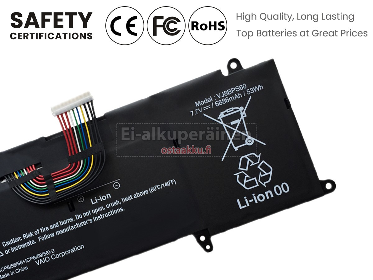 Vaihdettava akku Sony VJ8BPS60 on uusi. Ehdottomasti ei myydä käytettyjä akku tai uudistettu. Akut ovat valmistettu parhaista solujen ja komponentteja.