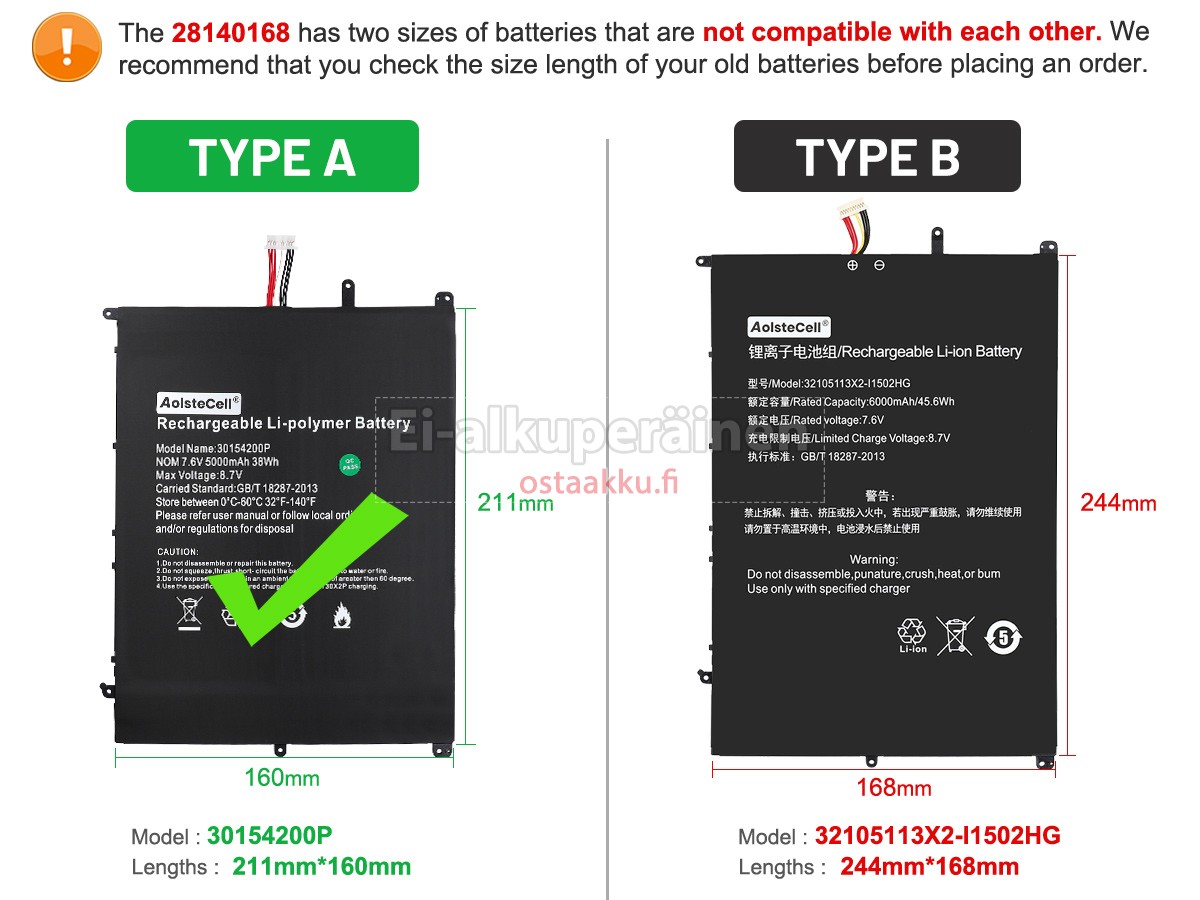 Ei muita eroja, paitsi ilman akku tuotemerkkiä. Kaikki akkuja ovat saatavilla in ostaakku.fi valmiustilassa paristot alkuperäisiä valmistajia. Hyväksyy ytimet ja älykäs soluja, kuten alkuperäisiä valmistajia, joten suorituskyky ja yhteensopivuus Teclast 28140168 akku on samanlainen kuin alkuperäisen akku ja paremmin. Tämä vähentää palkkion brändistä, varmistaa laadun. Monet asiakkaat ajattelevat, että alkuperäinen akku on parempi suorituskyky. Itse asiassa, kannettavani akkuja tuotemerkkejä ovat myös monet kolmannen osapuolen komponentteja (kuten Samsung, LG, jne). Kuten Kannettavani keskusyksikkö, brändin oma tietokoneyritys ei ole sitä kehittänyt.