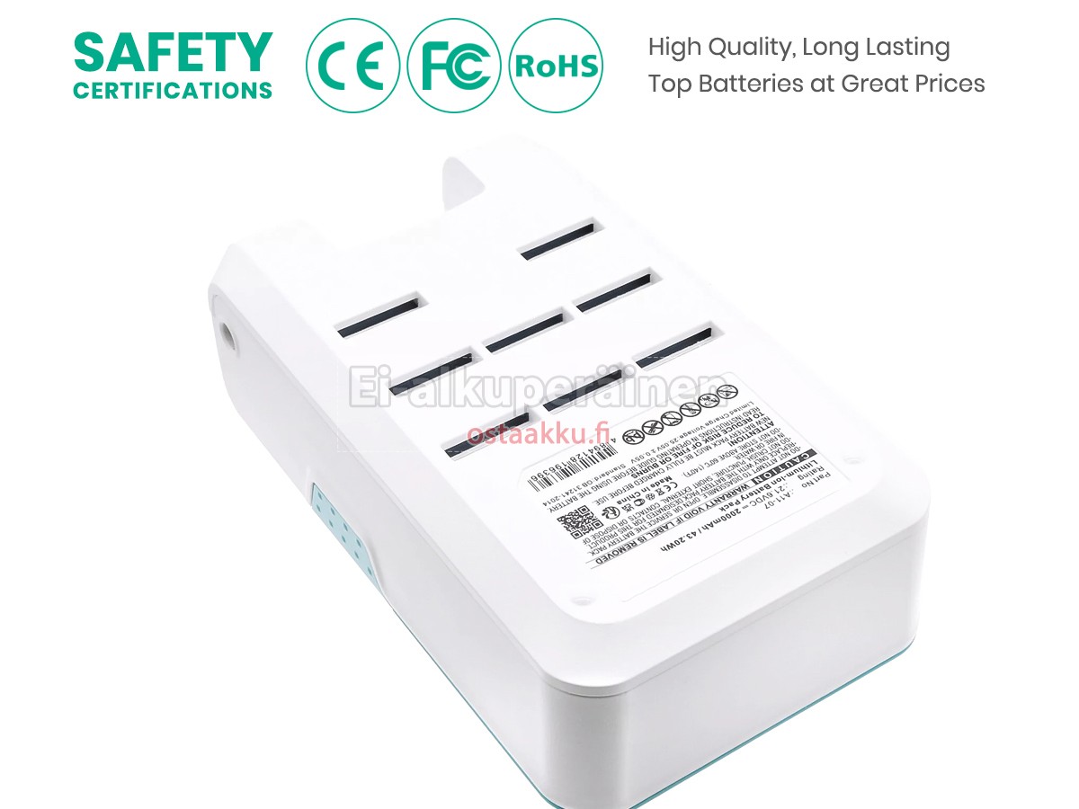 Varaenergian akku uusi Tineco A11-07 valmistetaan hienoimmista solujen ja komponentteja. Tineco A11-07 akku säädetään in abc.com hyväksytyn UN38.3, RCM, CE, UL, ROHS, ISO9001/ISO9002 ja muiden kansainvälisten sertifiointia. Jotta voidaan minimoida mahdollinen turvallisuusriski ja varmistaa hyvän käyttäjäkokemuksen, tarjotaan erilaisia suojatoimia Tineco A11-07 pölynimurin akku kuten lämpösuojaus, virtapiirin suojaus, ylijännitesuojaus, laitteiston suojaus ja kynnyksen lähtövirran.