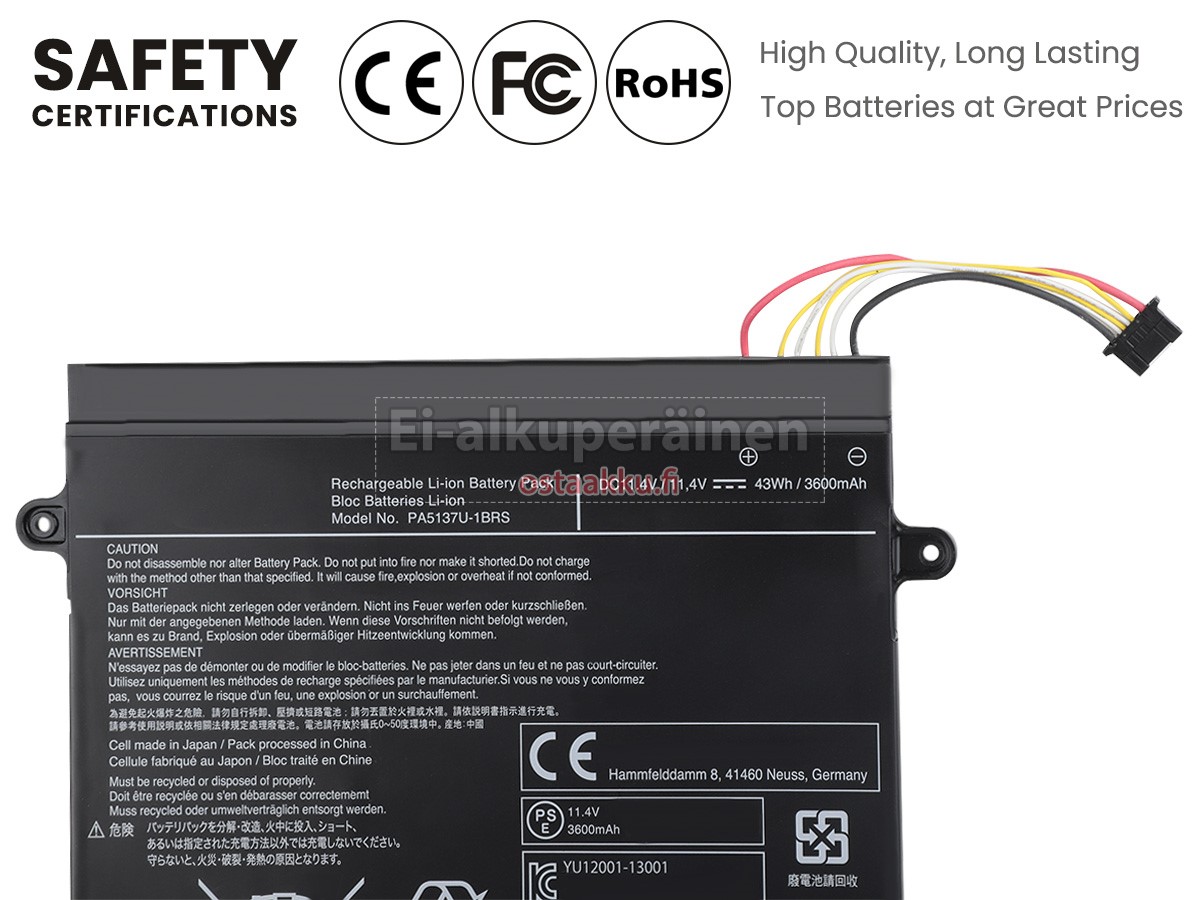 Vaihdettava akku Toshiba PA5137U-1BRS on uusi. Ehdottomasti ei myydä käytettyjä akku tai uudistettu. Akut ovat valmistettu parhaista solujen ja komponentteja.