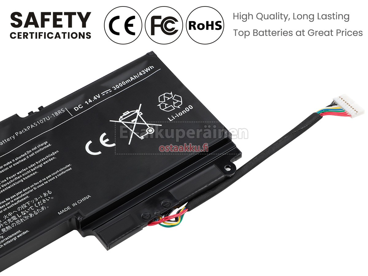 Varaenergian akku uusi Toshiba Satellite P55 valmistetaan hienoimmista solujen ja komponentteja. Toshiba Satellite P55 akku säädetään in abc.com hyväksytyn UN38.3, RCM, CE, UL, ROHS, ISO9001/ISO9002 ja muiden kansainvälisten sertifiointia. Jotta voidaan minimoida mahdollinen turvallisuusriski ja varmistaa hyvän käyttäjäkokemuksen, tarjotaan erilaisia suojatoimia Toshiba Satellite P55 Kannettavani akku kuten lämpösuojaus, virtapiirin suojaus, ylijännitesuojaus, laitteiston suojaus ja kynnyksen lähtövirran.