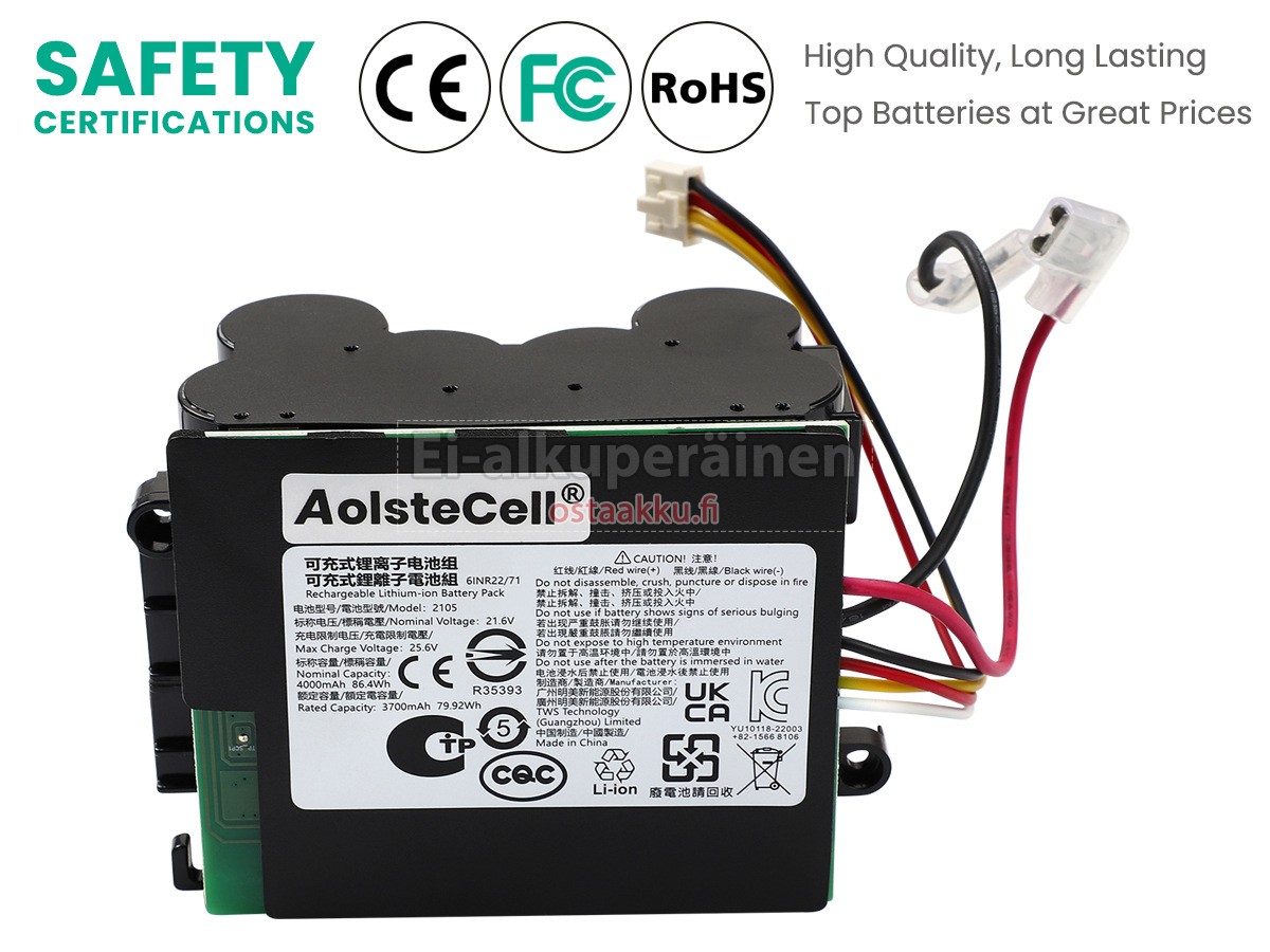 Varaenergian akku uusi XiaoMi 2105 valmistetaan hienoimmista solujen ja komponentteja. XiaoMi 2105 akku säädetään in abc.com hyväksytyn UN38.3, RCM, CE, UL, ROHS, ISO9001/ISO9002 ja muiden kansainvälisten sertifiointia. Jotta voidaan minimoida mahdollinen turvallisuusriski ja varmistaa hyvän käyttäjäkokemuksen, tarjotaan erilaisia suojatoimia XiaoMi 2105 pölynimurin akku kuten lämpösuojaus, virtapiirin suojaus, ylijännitesuojaus, laitteiston suojaus ja kynnyksen lähtövirran.