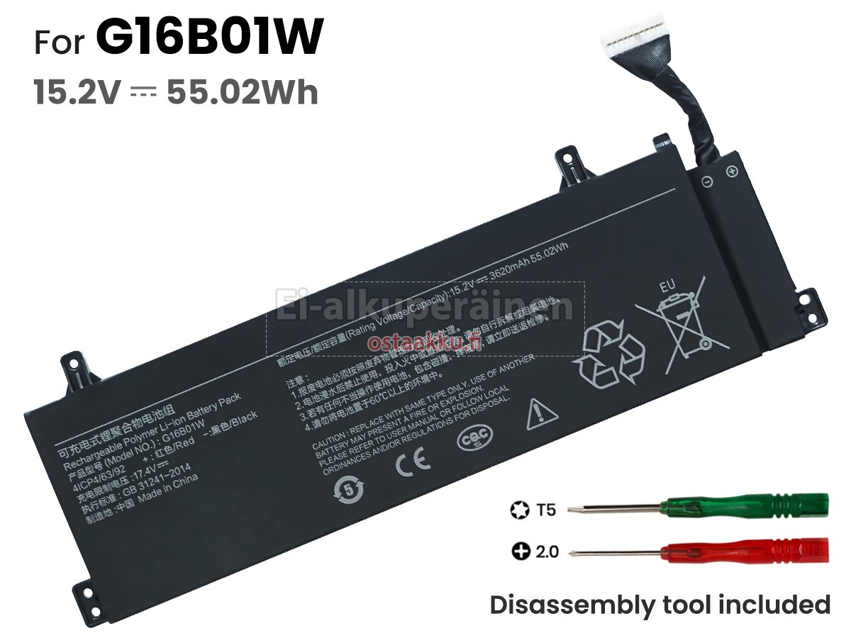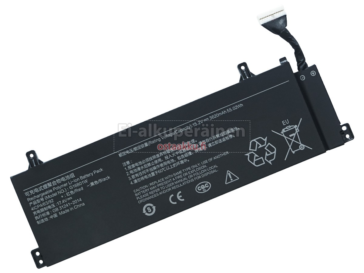 Varaenergian akku uusi XiaoMi G16B01W valmistetaan hienoimmista solujen ja komponentteja. XiaoMi G16B01W akku säädetään in abc.com hyväksytyn UN38.3, RCM, CE, UL, ROHS, ISO9001/ISO9002 ja muiden kansainvälisten sertifiointia. Jotta voidaan minimoida mahdollinen turvallisuusriski ja varmistaa hyvän käyttäjäkokemuksen, tarjotaan erilaisia suojatoimia XiaoMi G16B01W Kannettavani akku kuten lämpösuojaus, virtapiirin suojaus, ylijännitesuojaus, laitteiston suojaus ja kynnyksen lähtövirran.