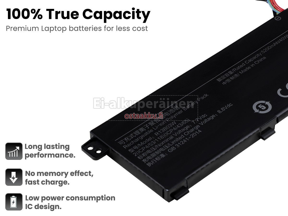 Ei muita eroja, paitsi ilman akku tuotemerkkiä. Kaikki akkuja ovat saatavilla in ostaakku.fi valmiustilassa paristot alkuperäisiä valmistajia. Hyväksyy ytimet ja älykäs soluja, kuten alkuperäisiä valmistajia, joten suorituskyky ja yhteensopivuus XiaoMi XMA1903-AF akku on samanlainen kuin alkuperäisen akku ja paremmin. Tämä vähentää palkkion brändistä, varmistaa laadun. Monet asiakkaat ajattelevat, että alkuperäinen akku on parempi suorituskyky. Itse asiassa, kannettavani akkuja tuotemerkkejä ovat myös monet kolmannen osapuolen komponentteja (kuten Samsung, LG, jne). Kuten Kannettavani keskusyksikkö, brändin oma tietokoneyritys ei ole sitä kehittänyt.